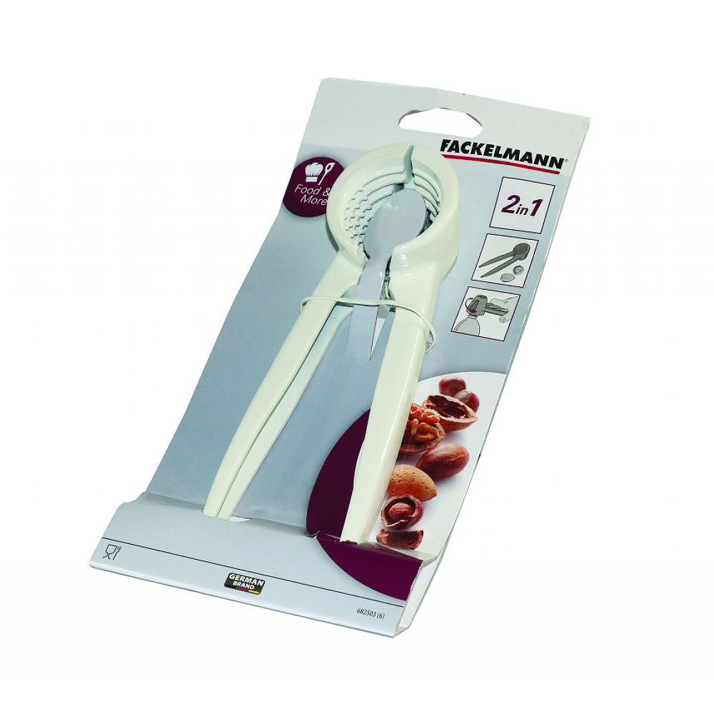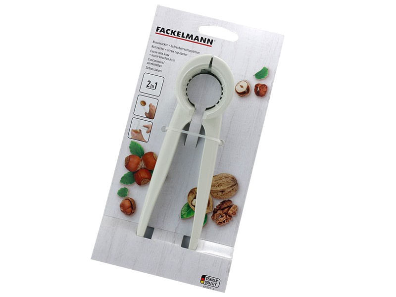 Dziadek do orzechów niemieckiej firmy Fackelmann posiada dodatkowe funkcje otwieracza do szampana i zakręcanych butelek. Wykonany jest z mocnego, grubego aluminium lakierowanego.