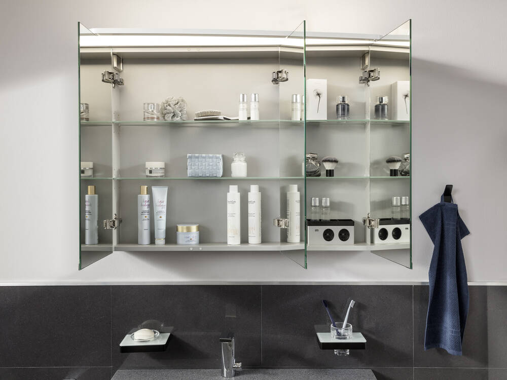 - Szafka lustrzana z efektem 3D umożliwiającym oglądanie sylwetki z każdej strony. Dodatkowo oświetlenie LED doskonale oświetli twarz podczas golenia lub makijażu.