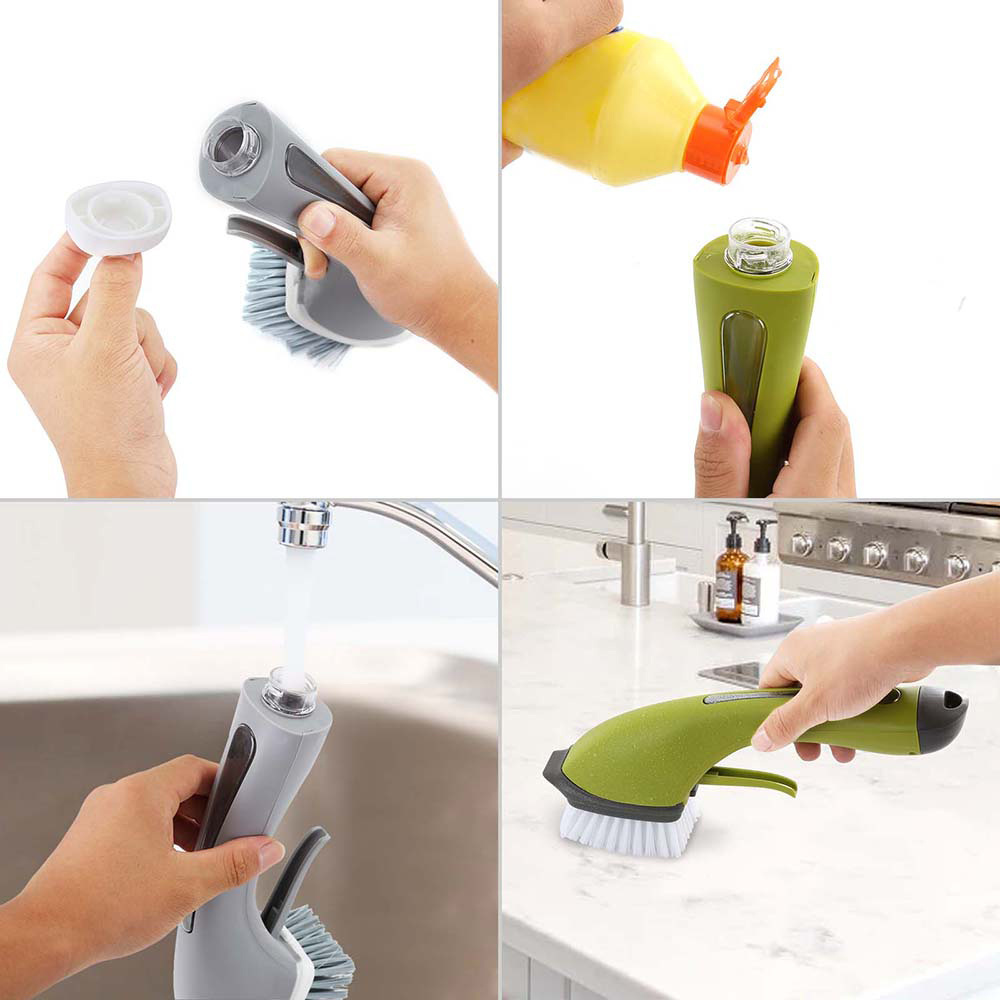 Szczotka do mycia i szorowania z dozownikiem na płyn. Wykonana z tworzywa sztucznego łatwego w czyszczeniu. Pozwala na oszczędne oraz higieniczne umycie większości powierzchni wykorzystywanych w domu.