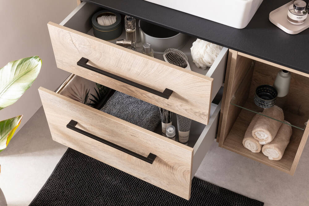 Dwa modele podstawowe, szafka pod umywalkę z szufladami o szerokości 60 cm oraz otwartej półce o szerokości 30 cm, umożliwia stworzenie wielu wariantów do przechowywania.