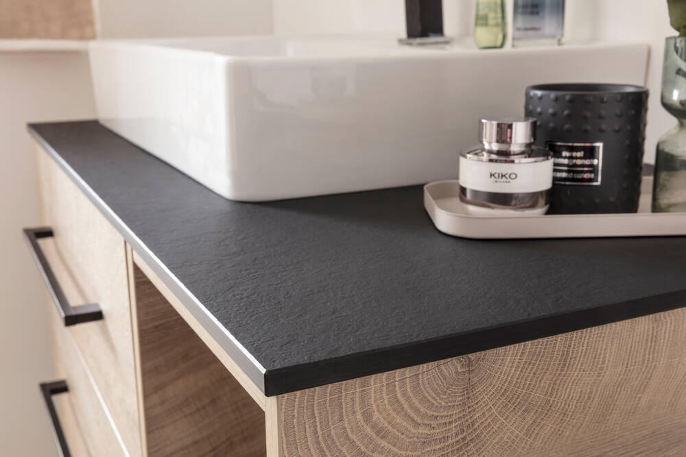 Asortyment tej serii jest bardzo bogaty. Znajdziemy tu blaty na szafki łazienkowe o grubości 12 mm w czterech różnych długościach (60, 90, 120 i 150) w czarnym stylowym dekorze ze strukturą łupka.