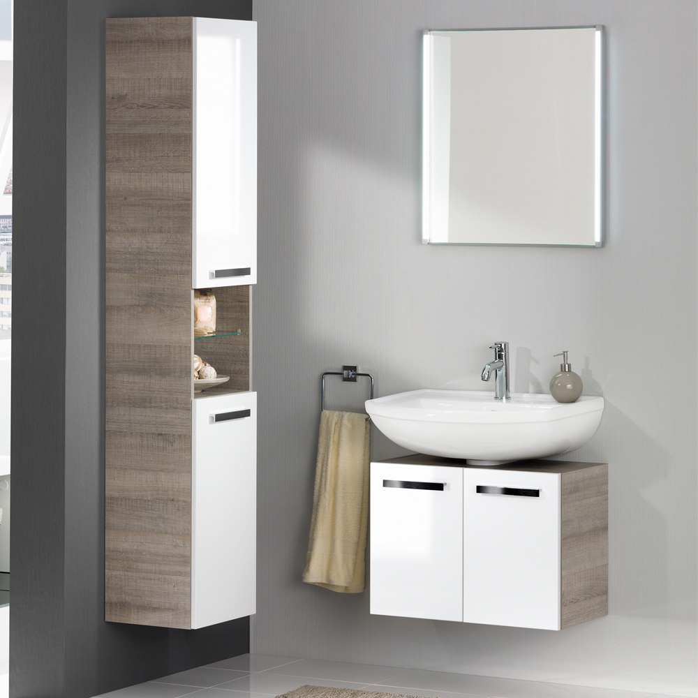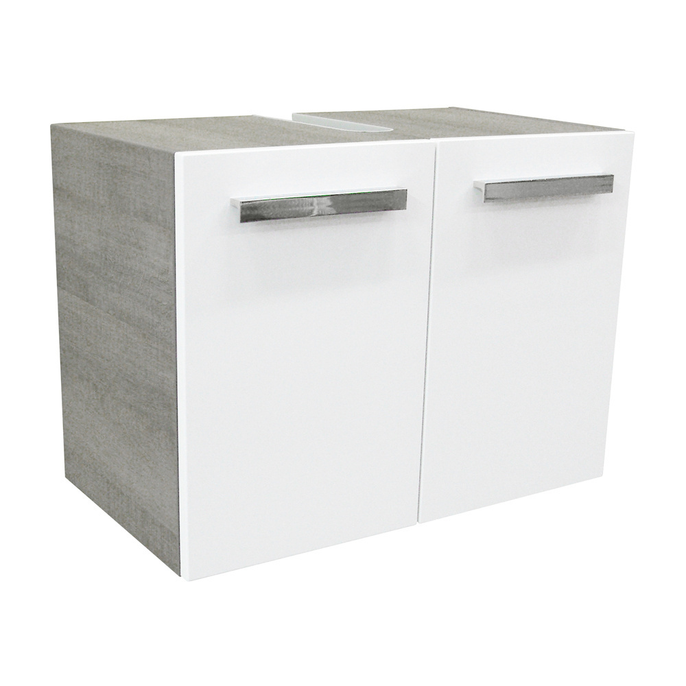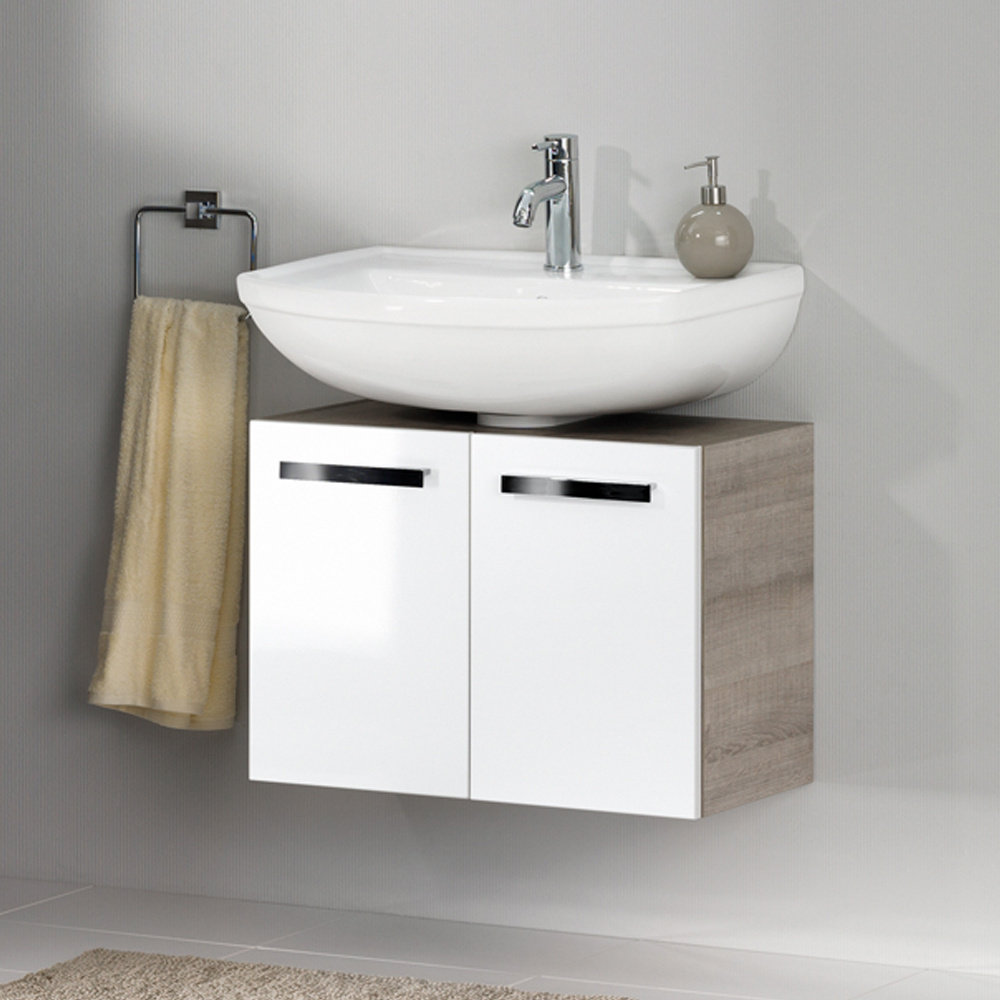 - Szafka łazienkowa pod umywalkę o szerokości 62,4 cm. Korpus w kolorze szary dąb, front w kolorze biały wysoki połysk.