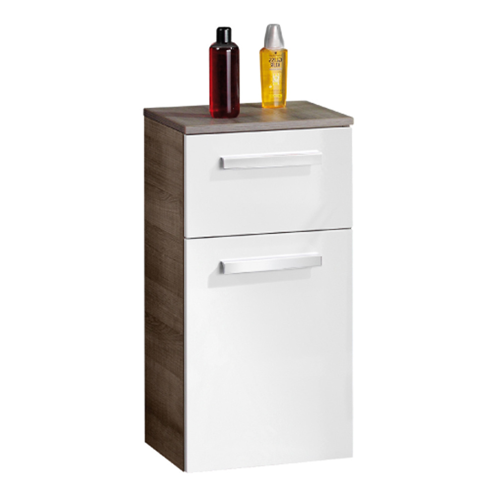 - Szafka łazienkowa boczna, dolna, wisząca o szerokości 35,2 cm. Korpus w kolorze szary dąb oraz front w kolorze biały wysoki połysk.
