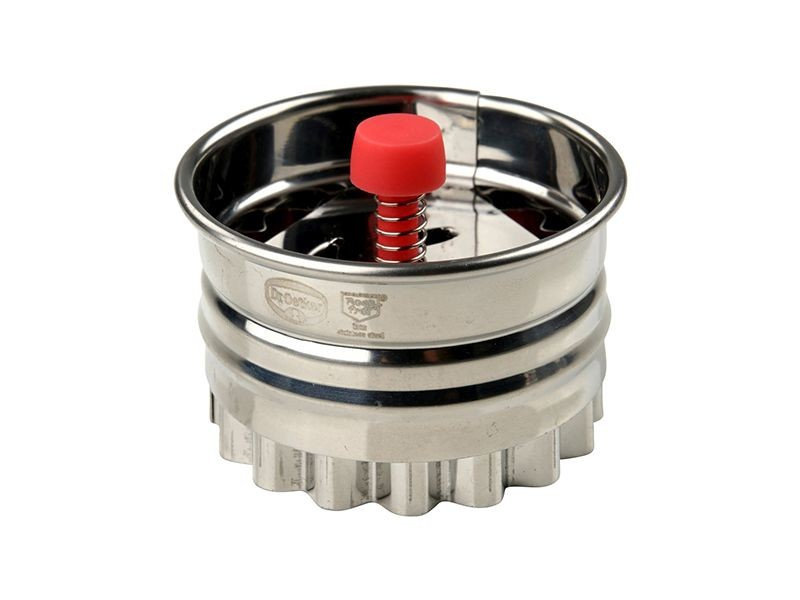 Wystarczy lekko nacisnąć mechanizm wyrzutnika, a ciasto zostanie szybko i łatwo usunięte z foremki do ciastek. Frez ma średnicę około 5 cm i wysokość około 3,5 cm.