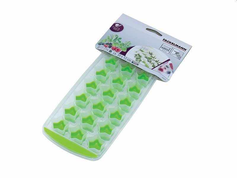 Dno formy jest elastyczne, dzięki czemu kostki lodu można łatwo wycisnąć z formy pojedynczo. Praktyczny pomocnik wykonany z tworzywa sztucznego bezpiecznego dla żywności jest dostępny w kształcie gwiazdy, za pomocą której można jednocześnie wykonać 21 lodowych gwiazdek. Płaski kształt (ok. 30 x 12 x 3 cm) można przechowywać w zamrażarce.