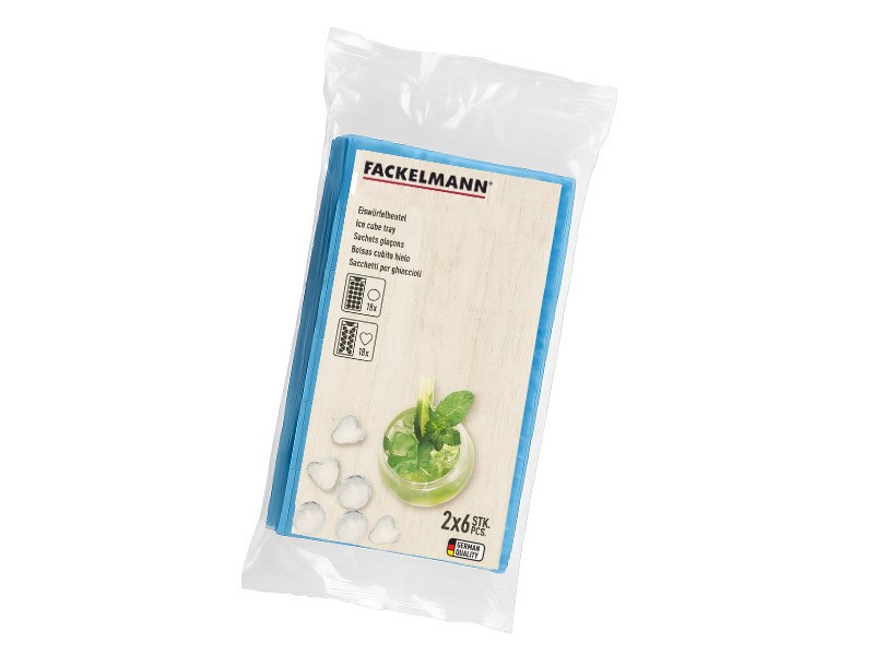 Woreczki na kostki lodu niemieckiej firmy Fackelmann wykonane z folii z automatycznym blokowaniem odpływu wody po odwróceniu napełnionego woreczka.