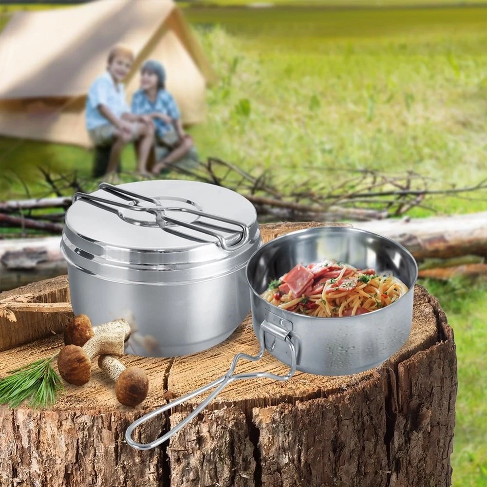 - Trzyczęściowa menażka turystyczna. W zestawie 2 naczynia ze składanymi uchwytami i pokrywka. Wykonana z najwyższej jakości stali nierdzewnej. Idealna na wyprawy, biwaki czy campingi.