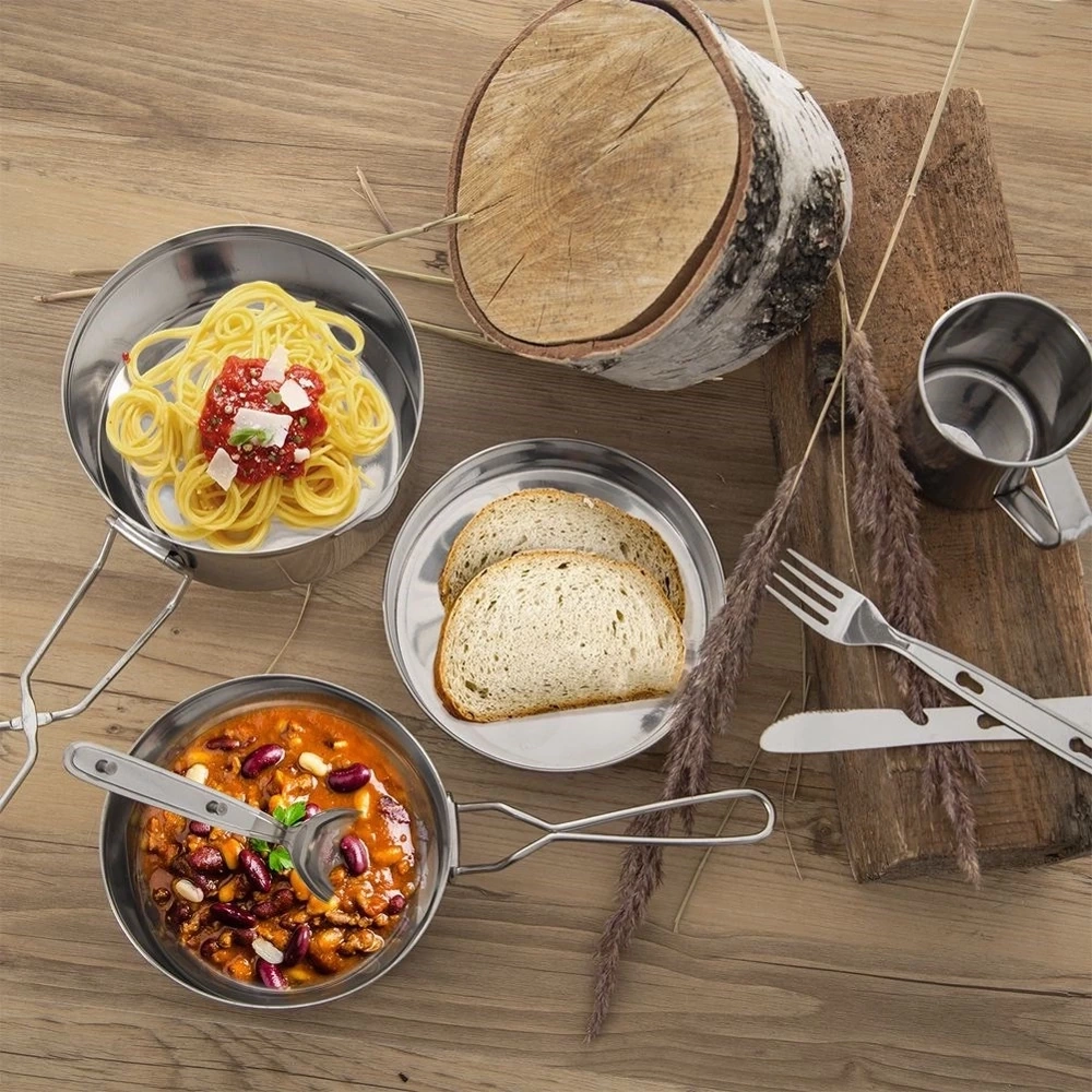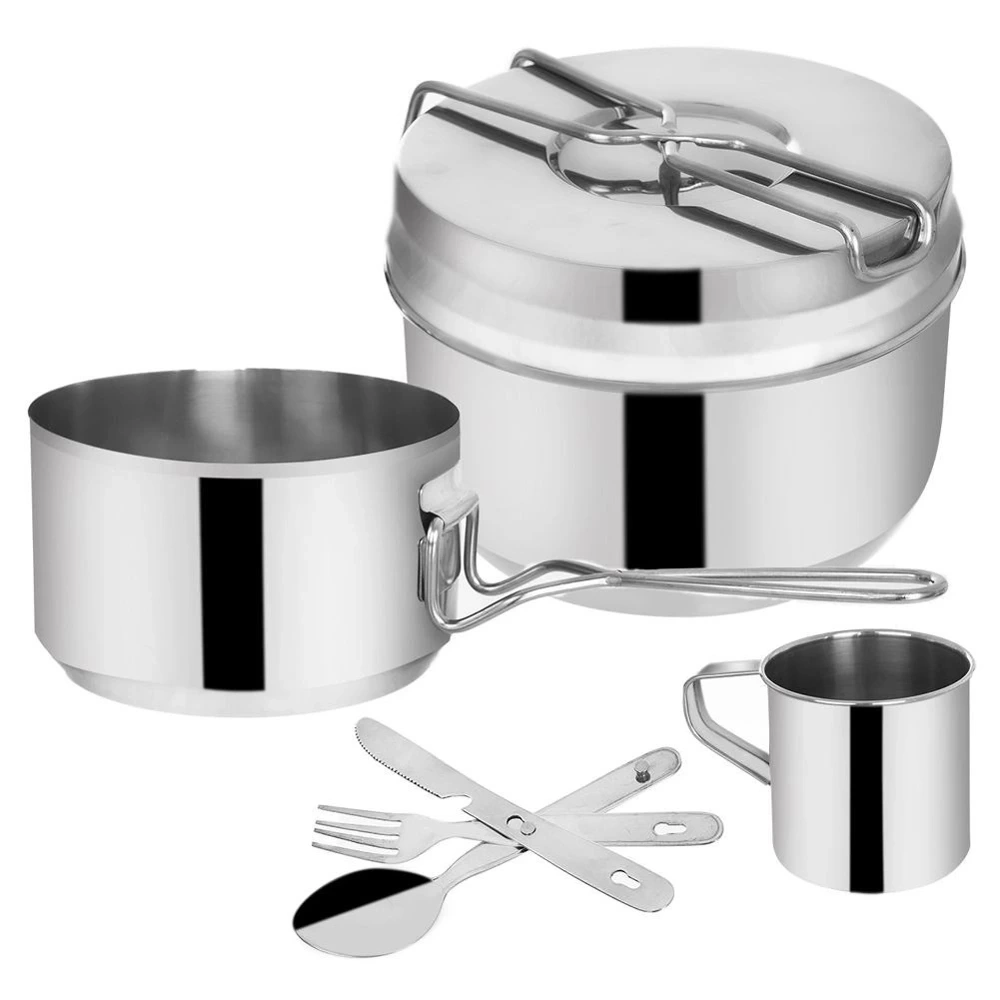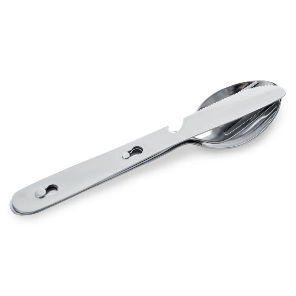 - PRAKTYCZNY - Zestaw turystyczny, idealny na obozy, wycieczki, wyprawy górskie, kempingi. W skład zestawu wchodzą: naczynia ze składanym uchwytem, pokrywka, która może służyć jako talerz, kubek oraz nóż z otwieraczem, łyżka i widelec.