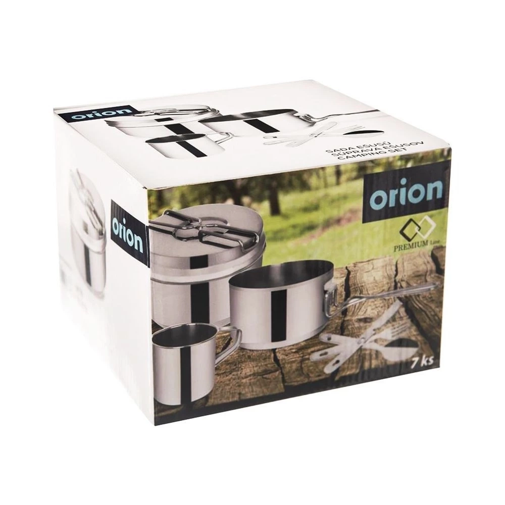 Menażka turystyczna składająca się z 7 elementów. W zestawie: 1x naczynie z składanym uchwytem (średnica 15 cm, wysokość 9 cm, poj. 1,5 l), 1x naczynie z składanym uchwytem (średnica 13 cm, wysokość 7,5 cm, poj. 0,9 l), 1x pokrywka, które może służyć jako talerz (średnica 15 cm, wysokość 3 cm), 1x kubek (7,5 cm, wysokość 8 cm, poj. 0,2 l), 1xnóż z otwieraczem, łyżka, widelec (długość 17 cm). Zestaw przydatny podczas wyjazdów za miasto, ale również pikników czy wycieczek. Oryginalny produkt czeskiej marki Orion. Wyprodukowano zgodnie z europejskimi standardami.
