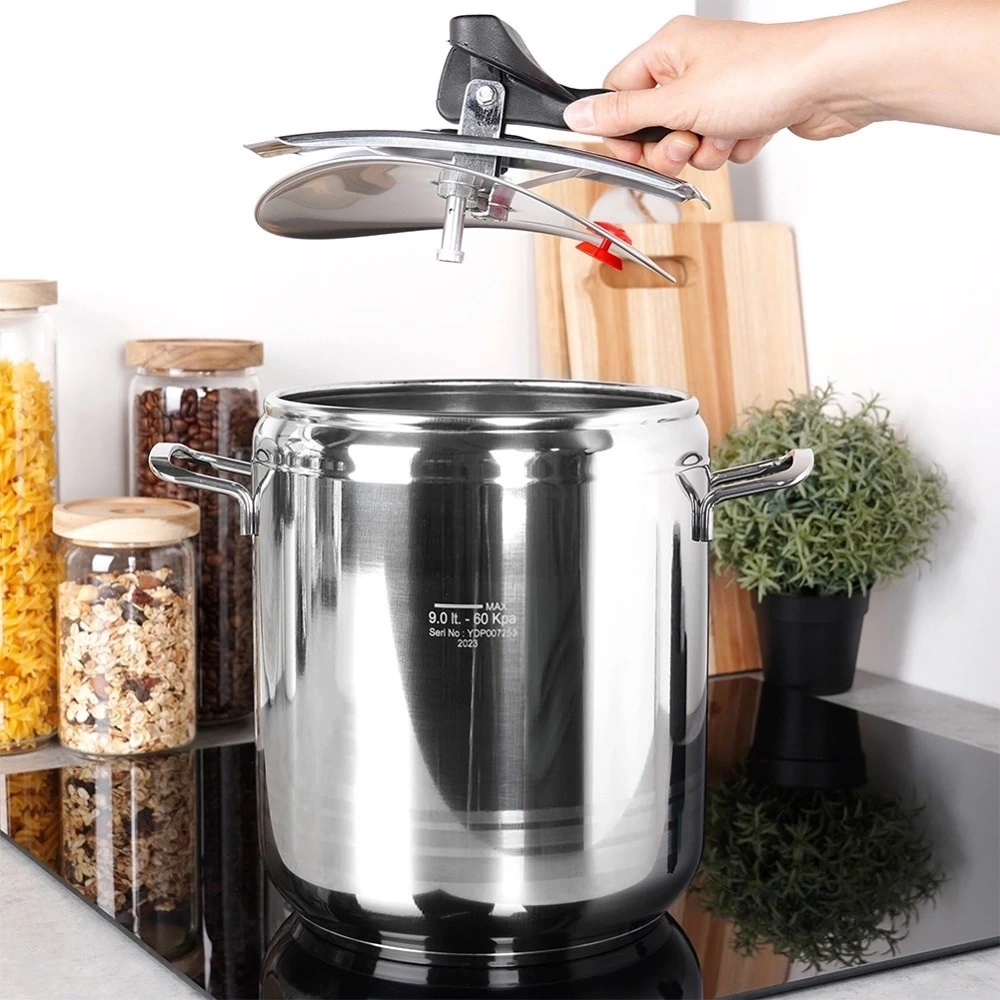- PRZYDATNY - Szybkowar o pojemności 9 litrów. Pomoże zaoszczędzić czas podczas przygotowywania posiłków. Szybkowar ma wymiary 25 x 31,5 x 22 cm.