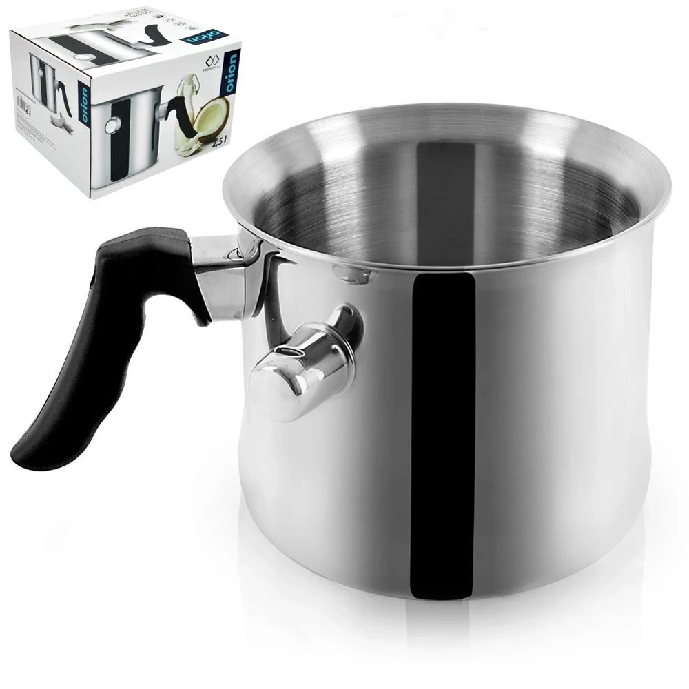 Garnek do podgrzewania mleka z wygodnym uchwytem oraz płaszczem wodnym. Niezwykle solidnie wykonany z najwyższej jakości materiałów. Łatwy w czyszczeniu. Dobrze kumuluje i rozprowadza ciepło. Dzięki uniwersalnemu zastosowaniu sprawdzi się również do przygotowania sosów, budyniów lub idealnego roztopienia czekolady do deserów. Przydatny w każdym domu. Oryginalny produkt czeskiej marki Orion. Wyprodukowano zgodnie z europejskimi standardami.