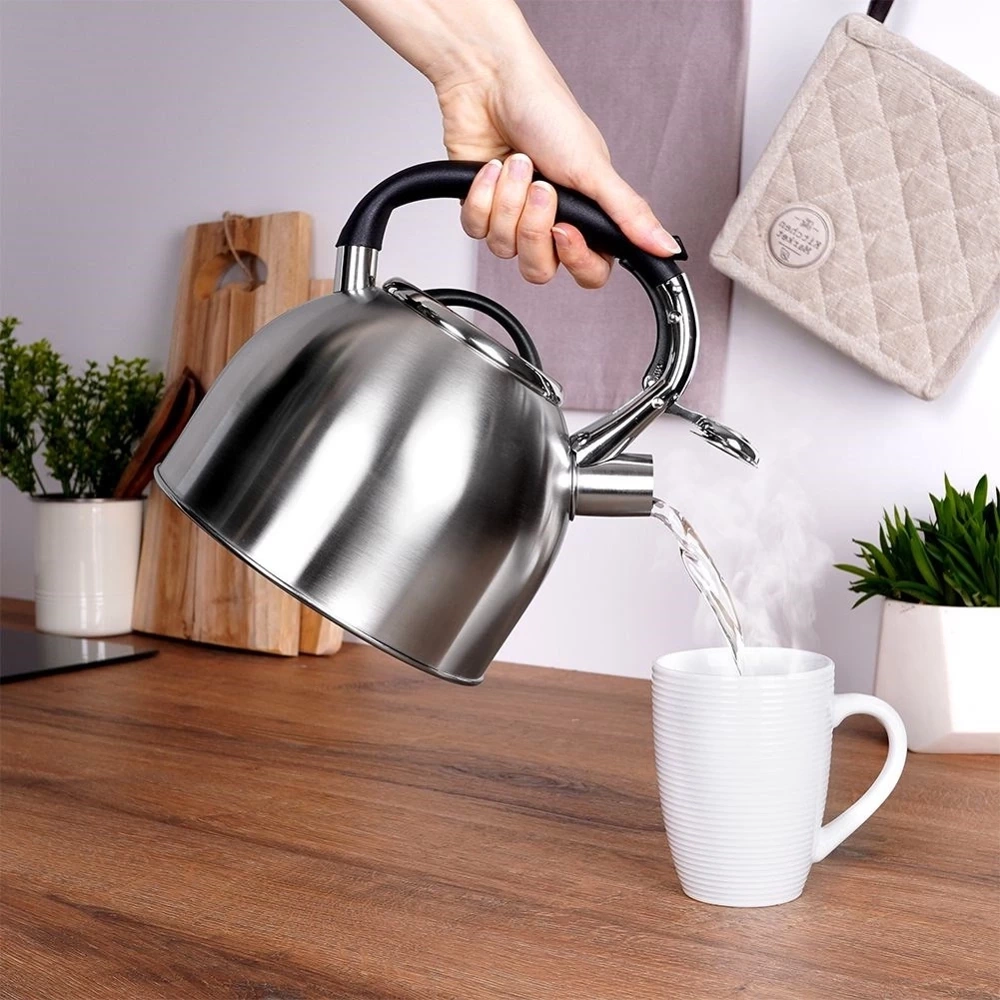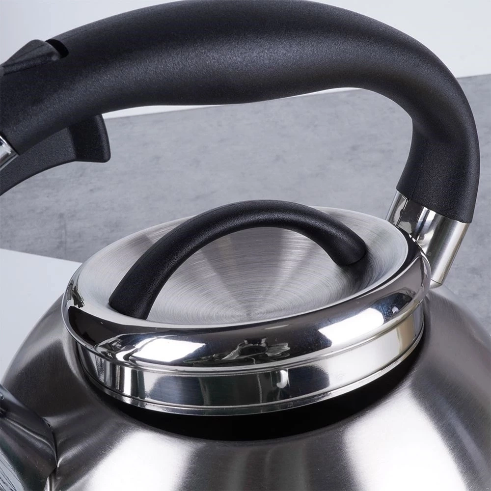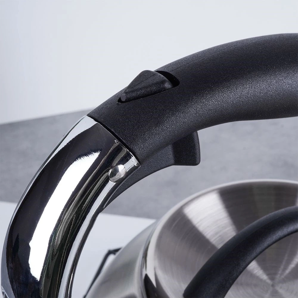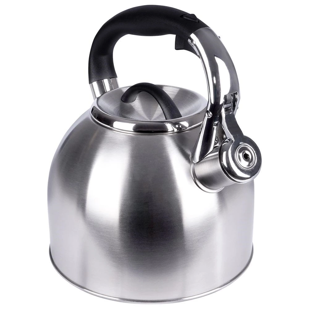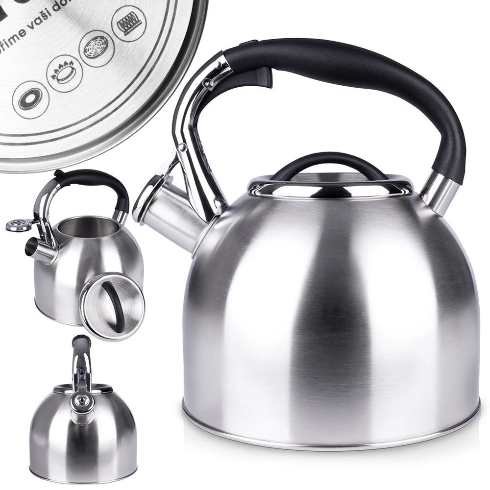 - Czajnik z automatycznym gwizdkiem. Wykonany ze stali nierdzewnej w kolorze srebrnym, uchwyt wykonany z tworzywa w czarnym kolorze. Nadaje się do każdego rodzaju kuchenek wraz z indukcją.