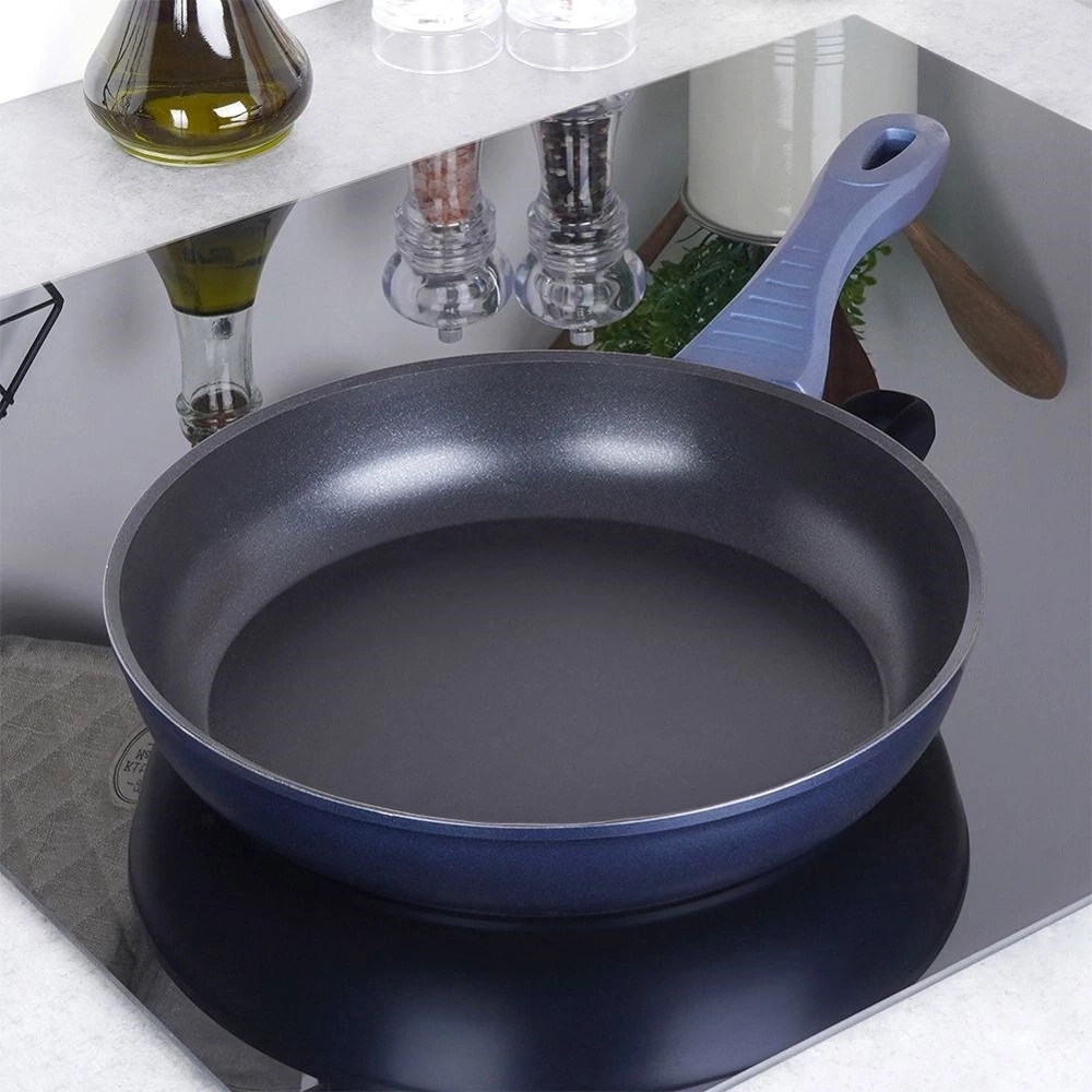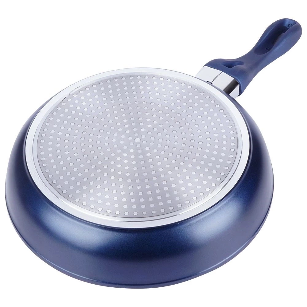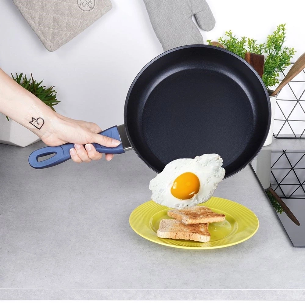 - NIEPRZYWIERAJĄCA - Patelnia posiada powłokę diamentową, która nie wchodzi w reakcję z żywnością. Wytrzymała, nieprzywierająca powłoka na bazie ceramiki, zawiera cząstki diamentowe - dzięki czemu przewodzi ciepło lepiej niż miedź czy srebro. Użyta powłoka nie posiada PFOA, PTFE. Uchwyt patelni został wykonany z tworzywa powlekanego silikonem. Zewnętrzna część patelni oraz uchwyt są w kolorze granatowym.