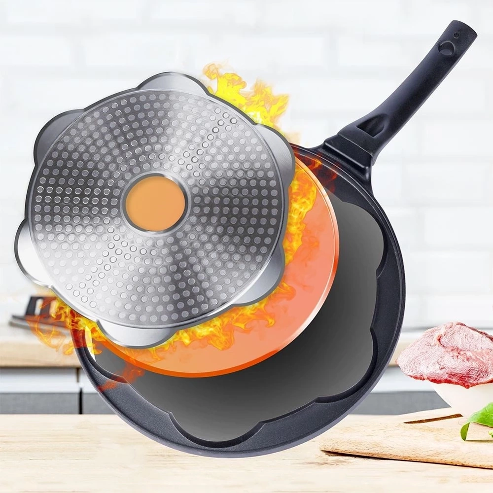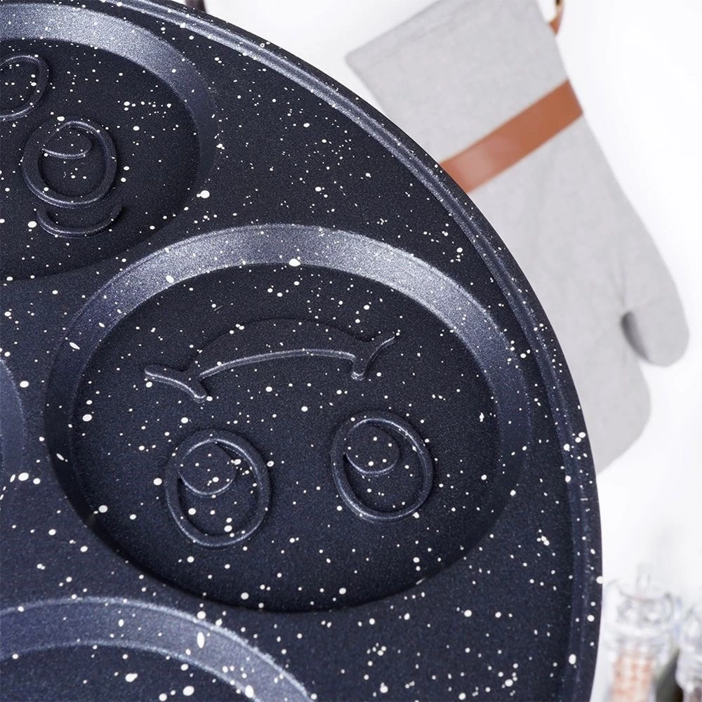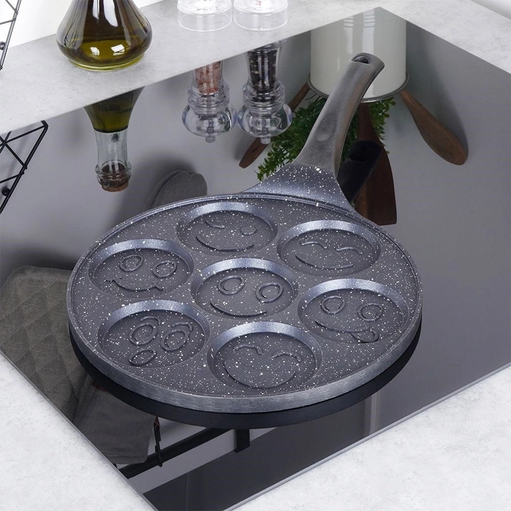 - Patelnia granitowa o średnicy 27 cm z 7 otworami z różnymi buźkami. Idealna do przygotowania naleśników, placuszków oraz jajek. Nadaje się na wszystkie rodzaje kuchni wraz indukcją.