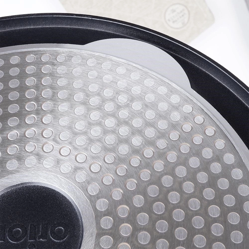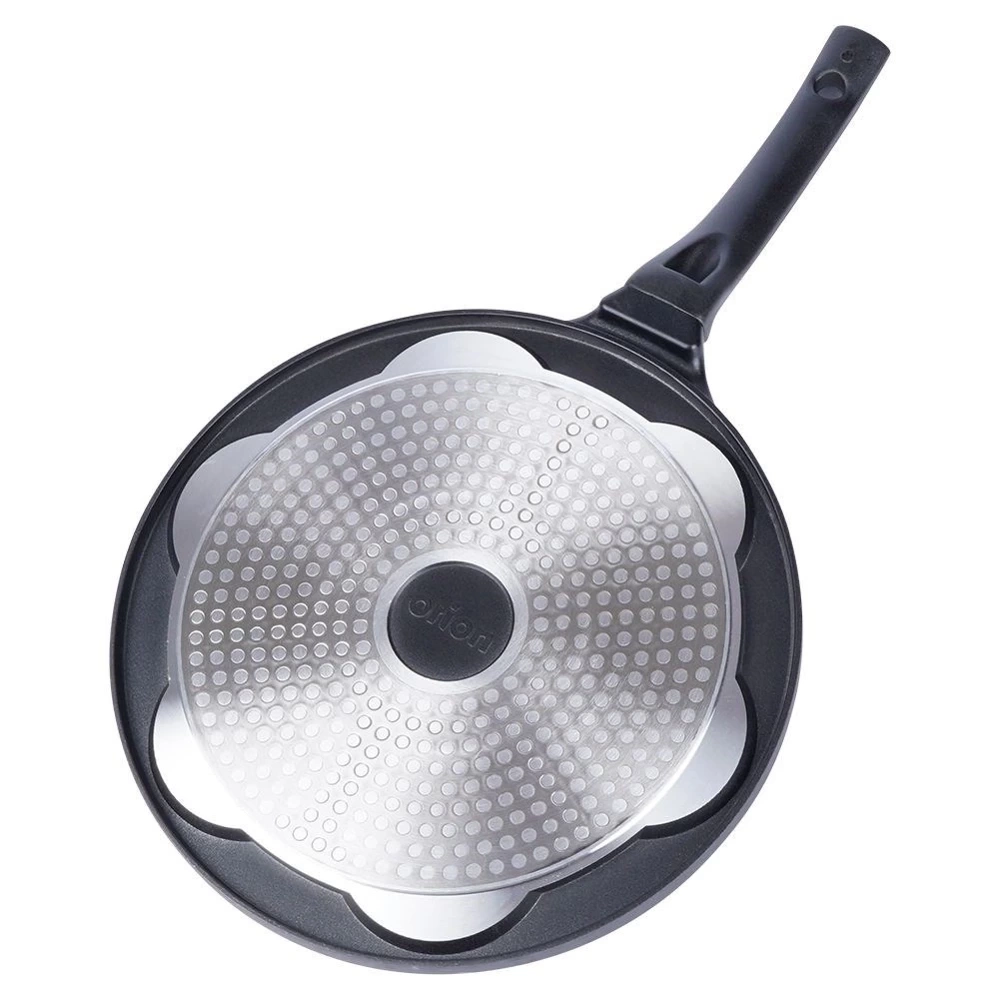 Patelnia o średnicy 27 cm. Przygotujesz na niej pyszne jajka sadzone czy ulubione placuszki śniadaniowe oraz mini naleśniki. Patelnia posiada 7 dedykowanych otworów w których przygotujemy idealne placuszki. Dzięki otworom umieszczonym w patelni możesz mieć pewność, że placuszki usmażą się równomiernie, a powłoka Pfluon granit zapobiegnie przywieraniu placuszków do powierzchni, a także sprawia, że możesz użyć tylko minimalnej ilości tłuszczu do smażenia. Patelnia z powodzeniem sprawdzi się także do przygotowania jajek. Doskonałe przewodnictwo materiału eliminuje straty ciepła, a tym samym pozwala to na oszczędność czasu potrzebnego do przygotowania potrawy. Można stosować na wszystkich typach kuchenek wraz z indukcją. Posiada nienagrzewający uchwyt wykonany z wytrzymałego tworzywa sztucznego. Oryginalny produkt czeskiej marki Orion. Wyprodukowano zgodnie z europejskimi standardami.