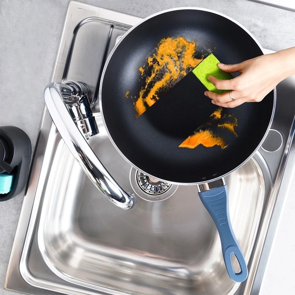 - Nieprzywierająca powłoka diamentowa - Patelnia posiada powłokę diamentową, która nie wchodzi w reakcję z żywnością. Wytrzymała, nieprzywierająca powłoka na bazie ceramiki, zawiera cząstki diamentowe - dzięki czemu przewodzi ciepło lepiej niż miedź czy srebro. Użyta powłoka nie posiada PFOA, PTFE. Uchwyt patelni został wykonany z tworzywa powlekanego silikonem. Zewnętrzna część patelni oraz uchwyt są w kolorze granatowym.
