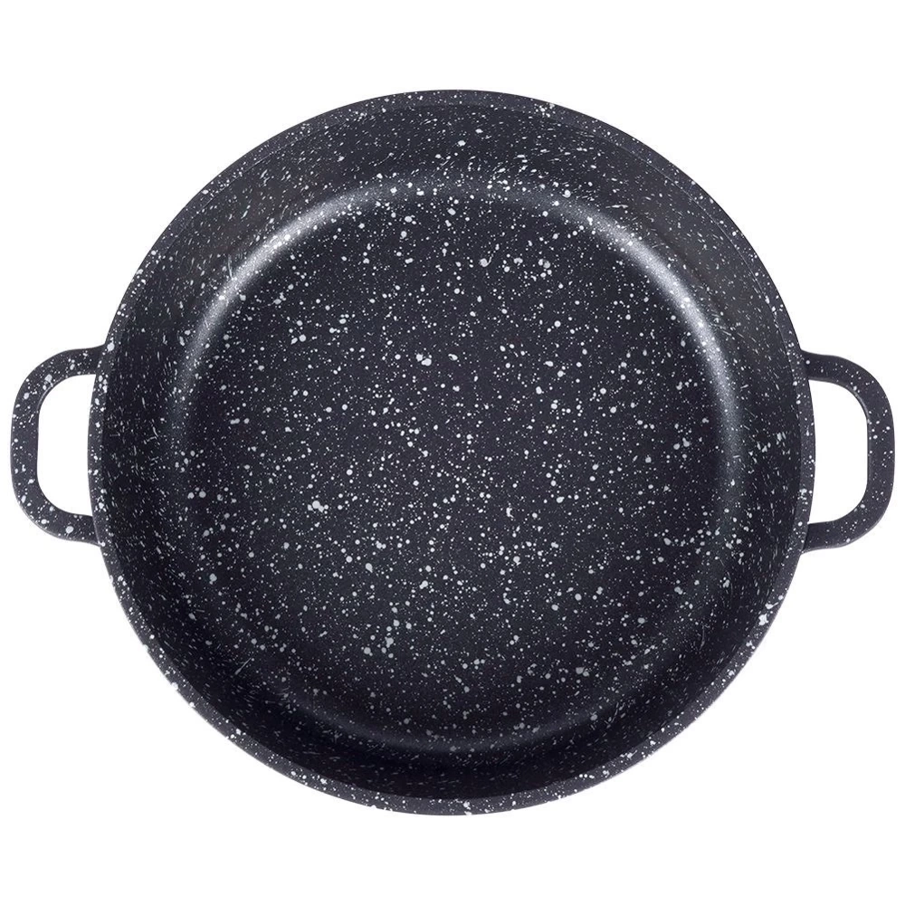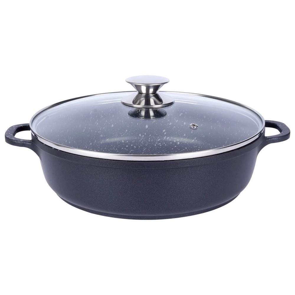 - NIEZAWODNA - Patelnia o średnicy 28 cm i pojemności 4,3 litra z pokrywką. Patelnia wykonana z aluminium w czarnym kolorze, wewnątrz posiada nieprzywierającą powłokę granitową. Wyposażona w pokrywkę wykonaną ze szkła i stali nierdzewnej. Wymiary zewnętrzne patelni: 36 x 29 x 8 cm, wysokość z pokrywką wynosi 14 cm.