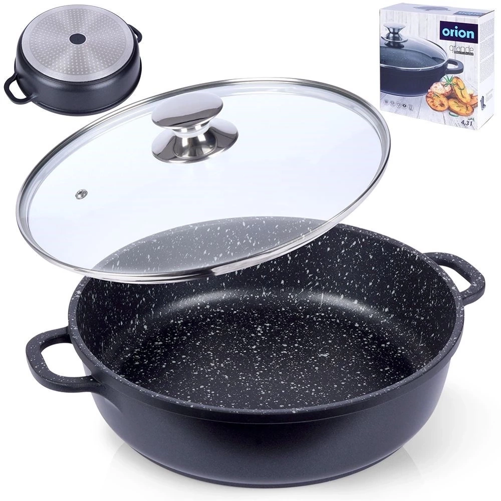 Nieprzywierająca patelnia wyposażona w pokrywkę z odpowietrznikiem pary. Patelnia sprawdzi się do smażenia oraz duszenia, przygotujemy w niej różnego rodzaju mięso i warzywa. Nieprzywierająca powłoka pozwoli na wygodne przygotowanie dań, przy użyciu małej ilości tłuszczu. Efektownie prezentuje się w kuchni oraz podczas serwowania dań bezpośrednio na stole. W naszej ofercie również inne naczynia z serii GRANDE. Oryginalny produkt czeskiej marki Orion. Wyprodukowano zgodnie z europejskimi standardami.