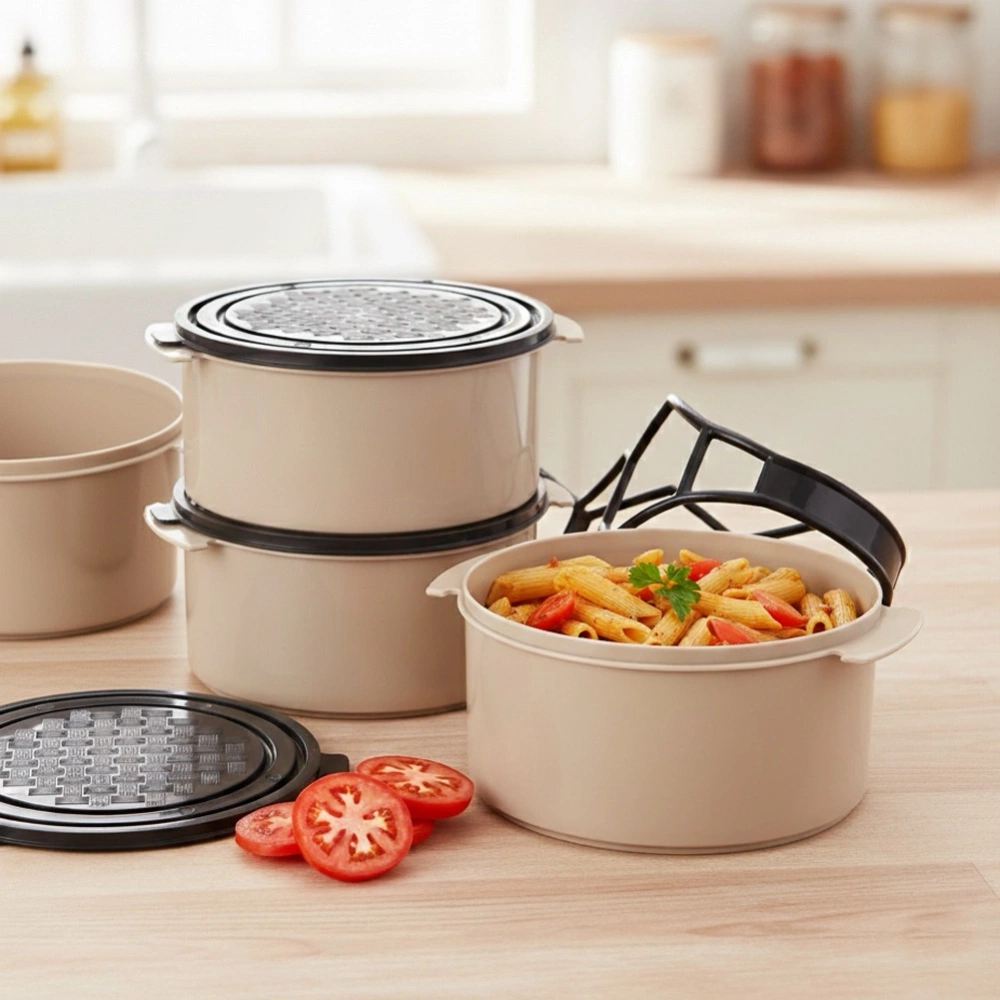 - WYGODNA - Menażka posiada uchwyt, za pomocą którego wygodnie i bezpiecznie przeniesiemy przygotowane posiłki. Pojemniki mogą służyć również jako miska do bezpośredniego spożycia posiłków.