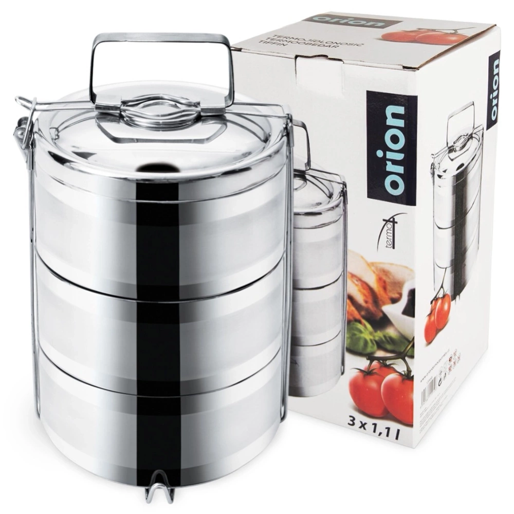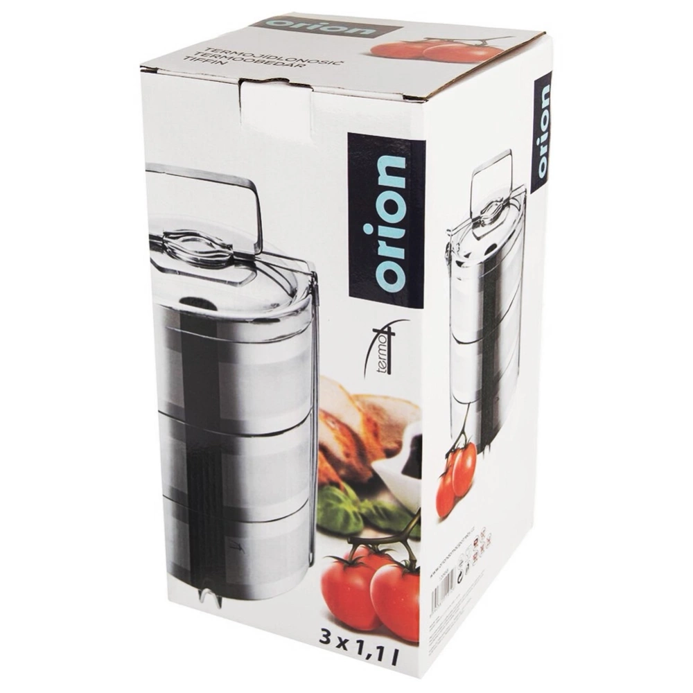 Menażka obiadowa termiczna do transportowania żywności. Wykonana z materiałów bezpiecznych dla zdrowia i neutralnych dla żywności. Posiada trzy pojemniki, które pozwolą odpowiednio przenieść posiłek. Pojemniki połączone są klamrą, dzięki czemu możemy wygodnie je piętrować. Doskonale sprawdzi się podczas wędrówek, biwaków, górskich wypraw oraz innych wypadów. Latem możemy wykorzystać ją do przechowywania i przenoszenia lodów np. podczas przyjęć w ogrodzie. Oryginalny produkt czeskiej marki Orion. Wyprodukowano zgodnie z europejskimi standardami.