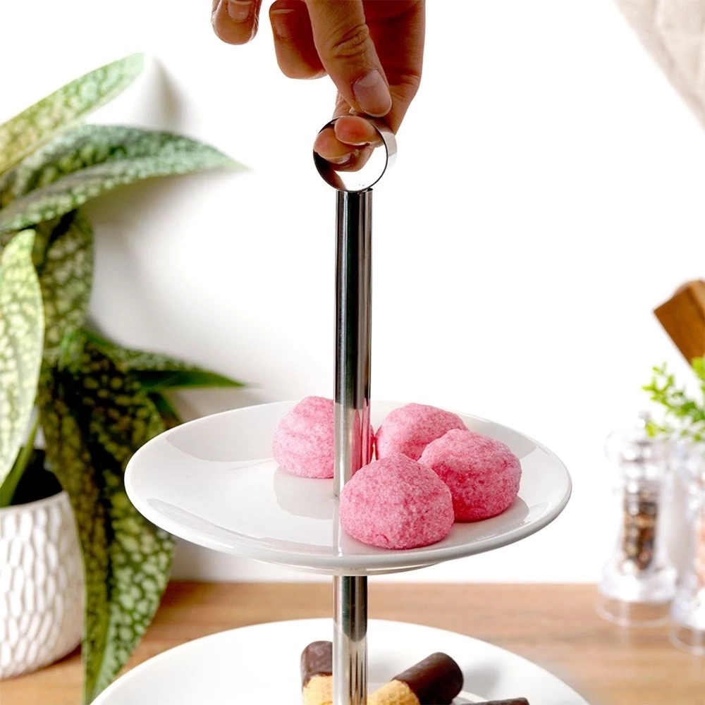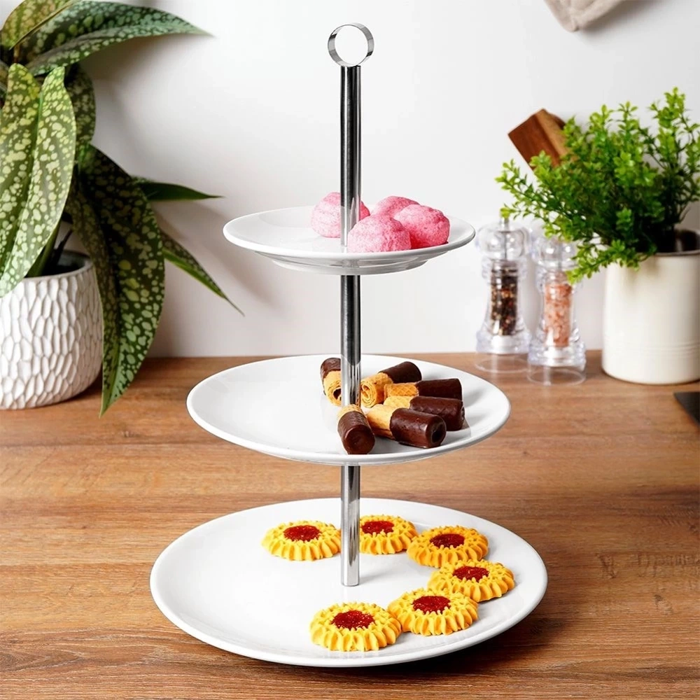 - Patera 3-poziomowa, okrągła, wykonana z białej porcelany oraz stali nierdzewnej. Idealna na ciasta, ciasteczka, owoce, cukierki, przekąski.