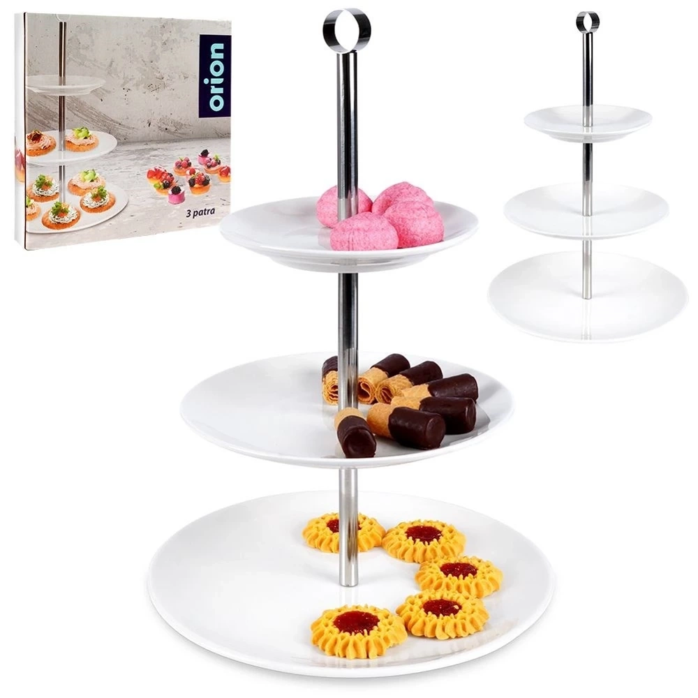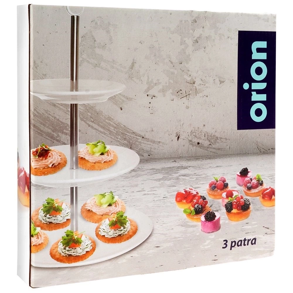 Trzypiętrowa patera do serwowania oraz ekspozycji. Świetnie prezentować się będą na niej babeczki, ciasteczka, różnego rodzaju desery jak również przystawki. Idealnie sprawdzi się do przygotowania słodkich stołów, dzięki niej w efektowny sposób wyeksponujemy na stole słodkości oraz słone przekąski. Sprawdzi się do użytku domowego oraz profesjonalnego. Oryginalny produkt czeskiej marki Orion. Wyprodukowano zgodnie z europejskimi standardami.