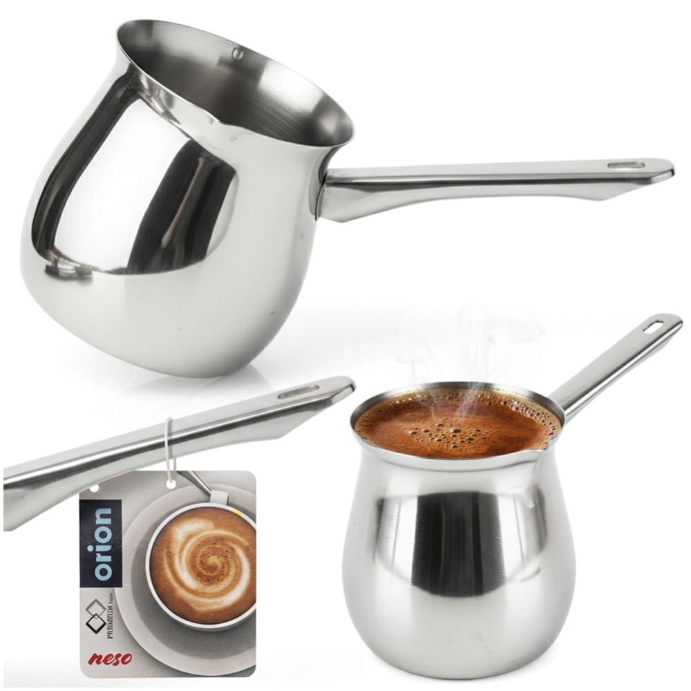 Stalowy tygielek do parzenia kawy po turecku to prawdziwy niezbędnik dla każdego miłośnika tego napoju. W celu uzyskania wyjątkowego smaku kawy po turecku należy wsypać zmielone ziarna kawy do tygielka, następnie zalać wodą i podgrzewać na małym ogniu. Należy powtarzać tą czynność kilkukrotnie, tak aby nie doprowadzić do wrzenia. Oryginalny produkt czeskiej marki Orion. Wyprodukowano zgodnie z europejskimi standardami.