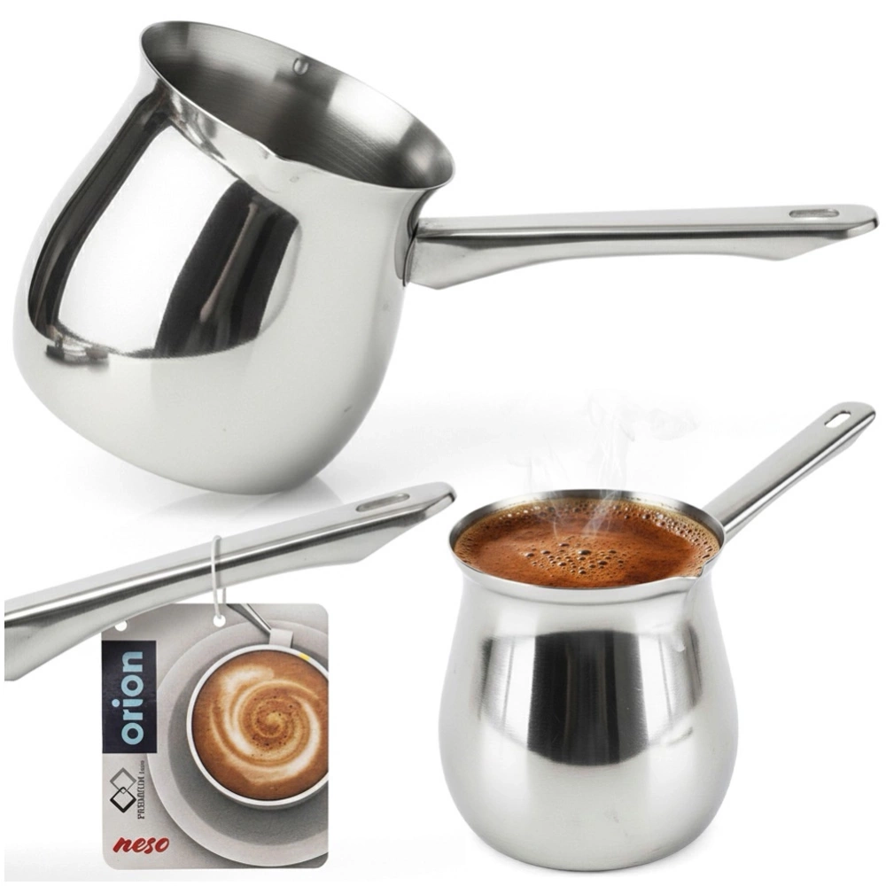 Stalowy tygielek do parzenia kawy po turecku to prawdziwy niezbędnik dla każdego miłośnika tego napoju. W celu uzyskania wyjątkowego smaku kawy po turecku należy wsypać zmielone ziarna kawy do tygielka, następnie zalać wodą i podgrzewać na małym ogniu. Należy powtarzać tą czynność kilkukrotnie, tak aby nie doprowadzić do wrzenia. Oryginalny produkt czeskiej marki Orion. Wyprodukowano zgodnie z europejskimi standardami.