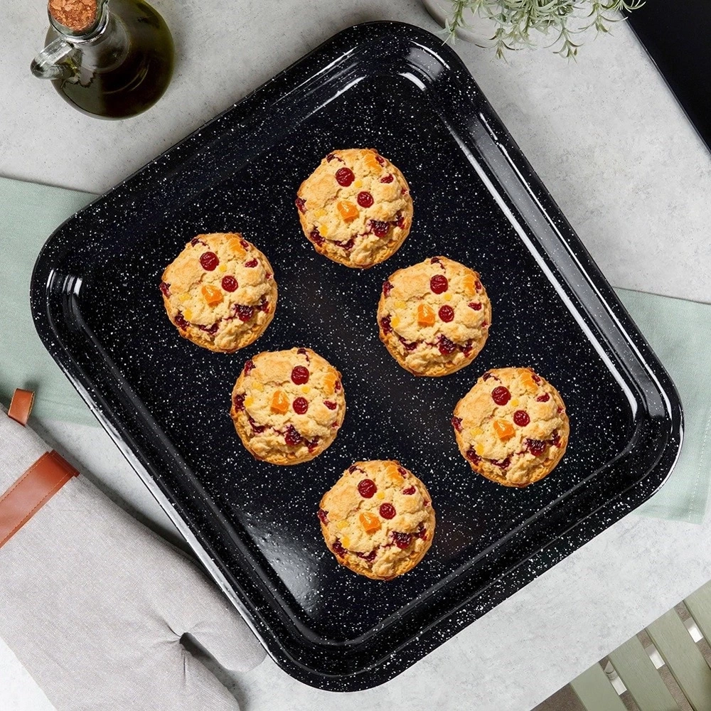 - Blacha wykonana ze stali emaliowanej. Idealna do pieczenia, smażenia wszystkich rodzajów mięs oraz wielu innych potraw. Łatwa w utrzymaniu czystości - potrawy nie przywierają.