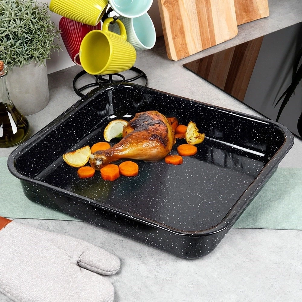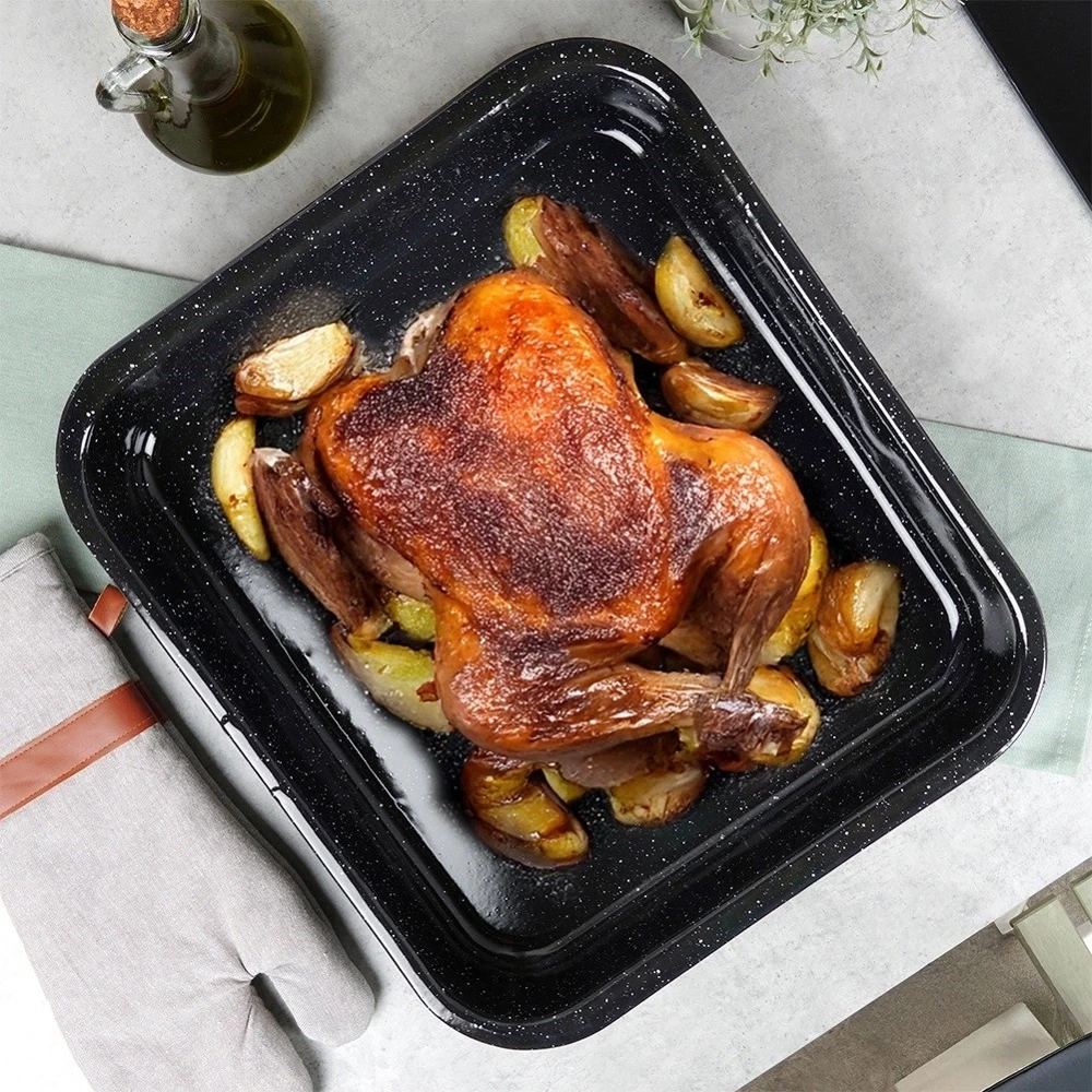 - Blacha wykonana ze stali emaliowanej. Idealna do pieczenia, smażenia wszystkich rodzajów mięs oraz wielu innych potraw. Łatwa w utrzymaniu czystości - potrawy nie przywierają.