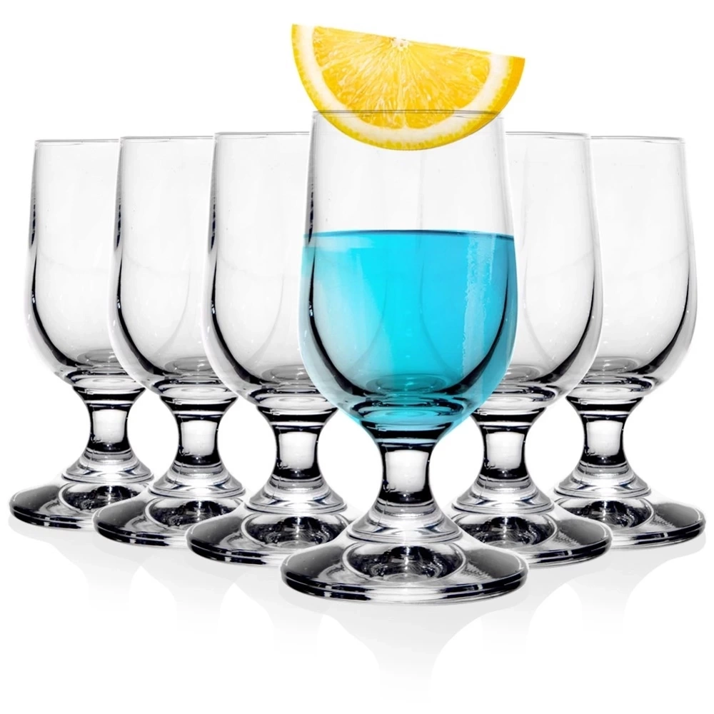 - PRAKTYCZNE - Zestaw sześciu kieliszków na nóżce. Każdy kieliszek ma pojemność 20 ml i wymiary 8,5 x 3 cm.