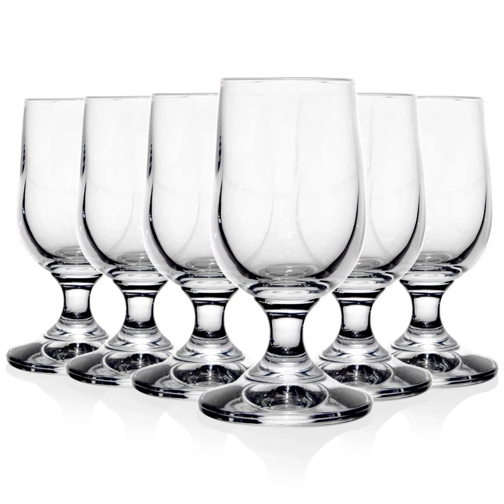 - Zestaw sześciu kieliszków na nóżce. Wykonane z najwyższej jakości szkła w przezroczystym kolorze. Nadają się do mycia w zmywarce do naczyń.