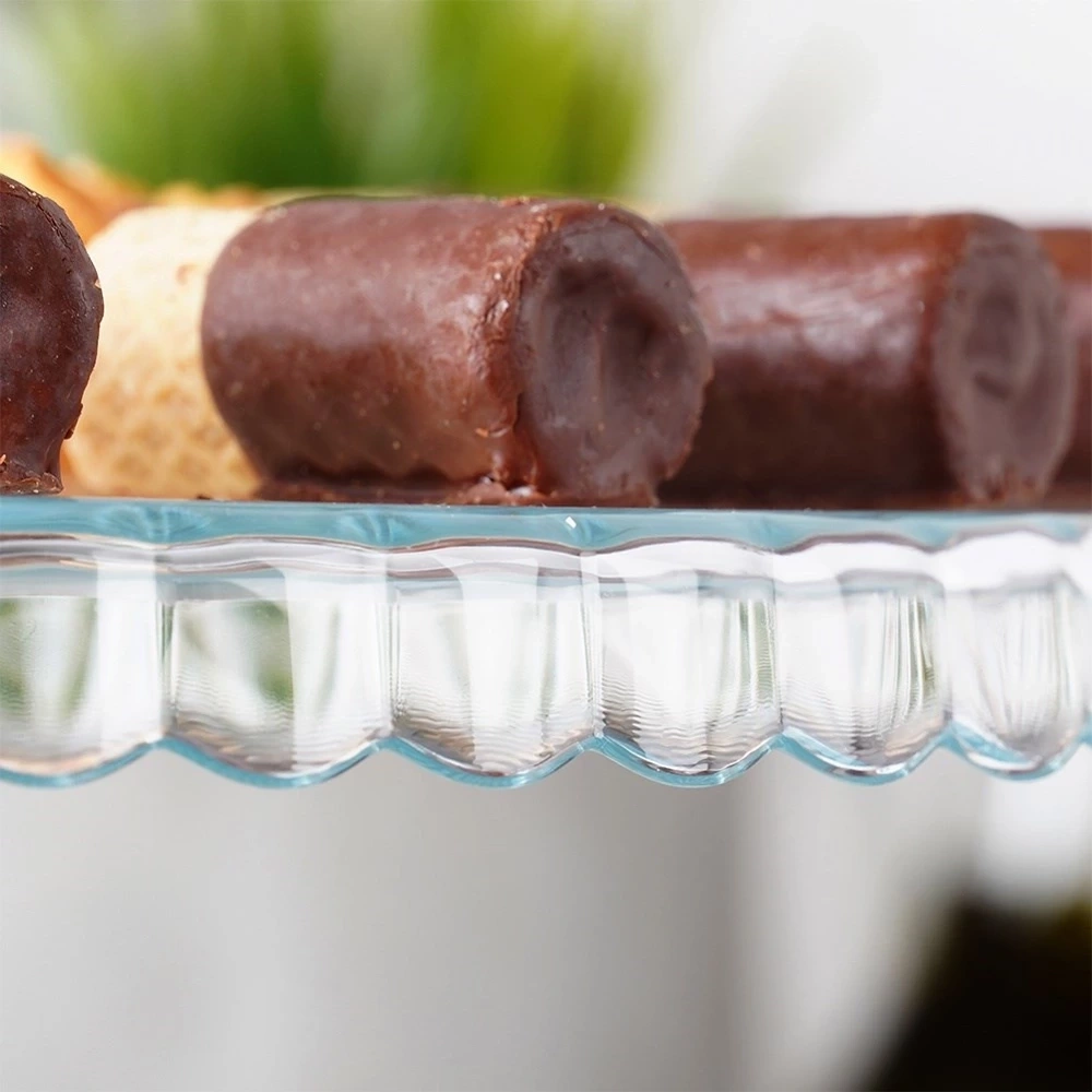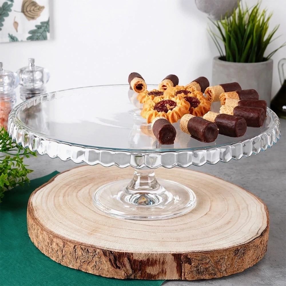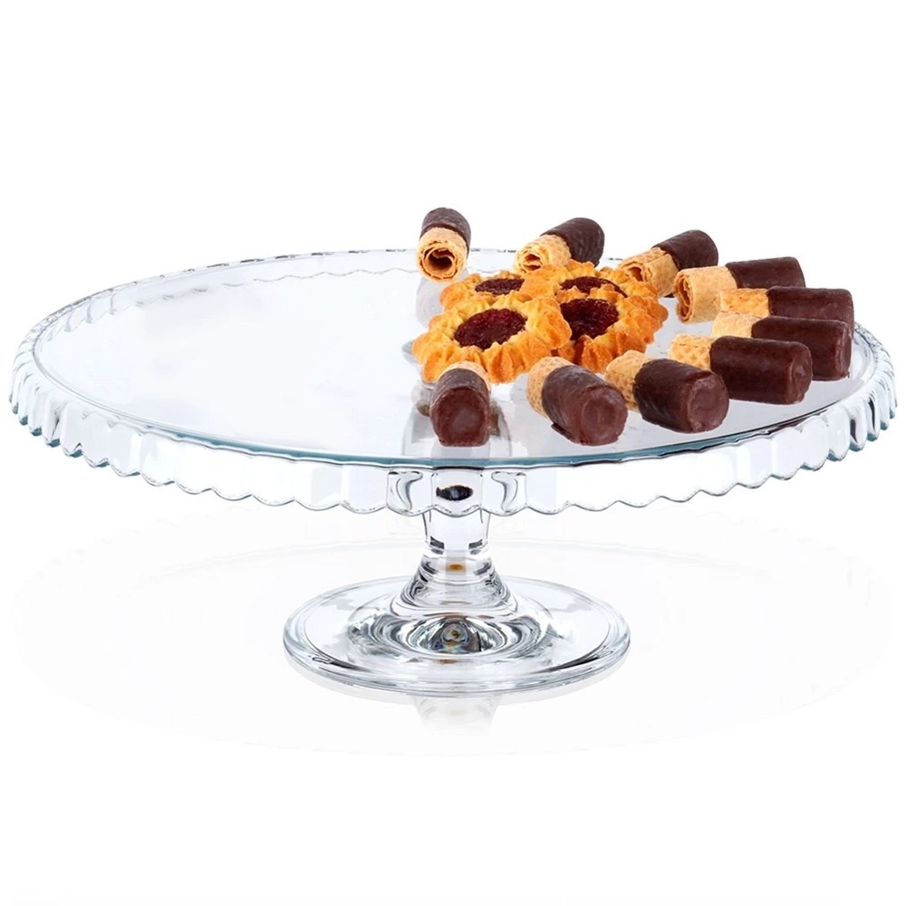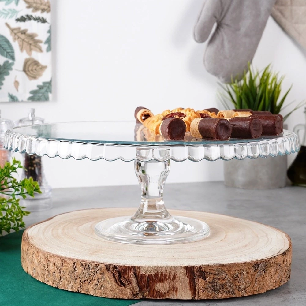 - Patera na nóżce o falistych krawędziach. Wykonana z wysokiej jakości szkła w przezroczystym kolorze. Idealna do ciast, tortów, muffinek, owoców.