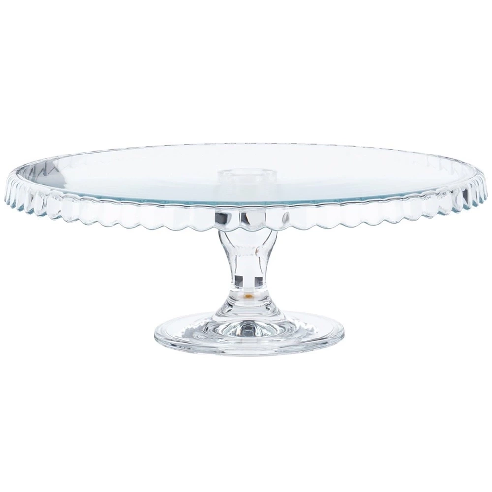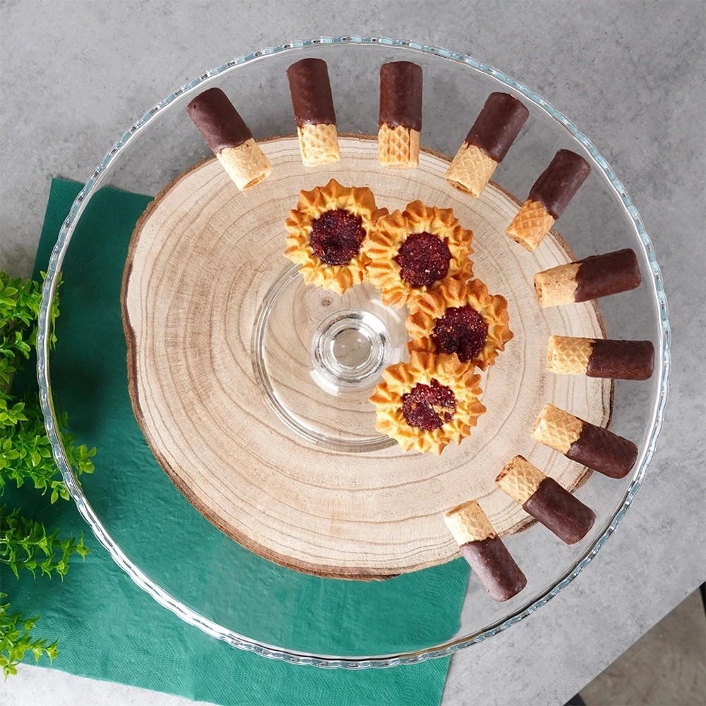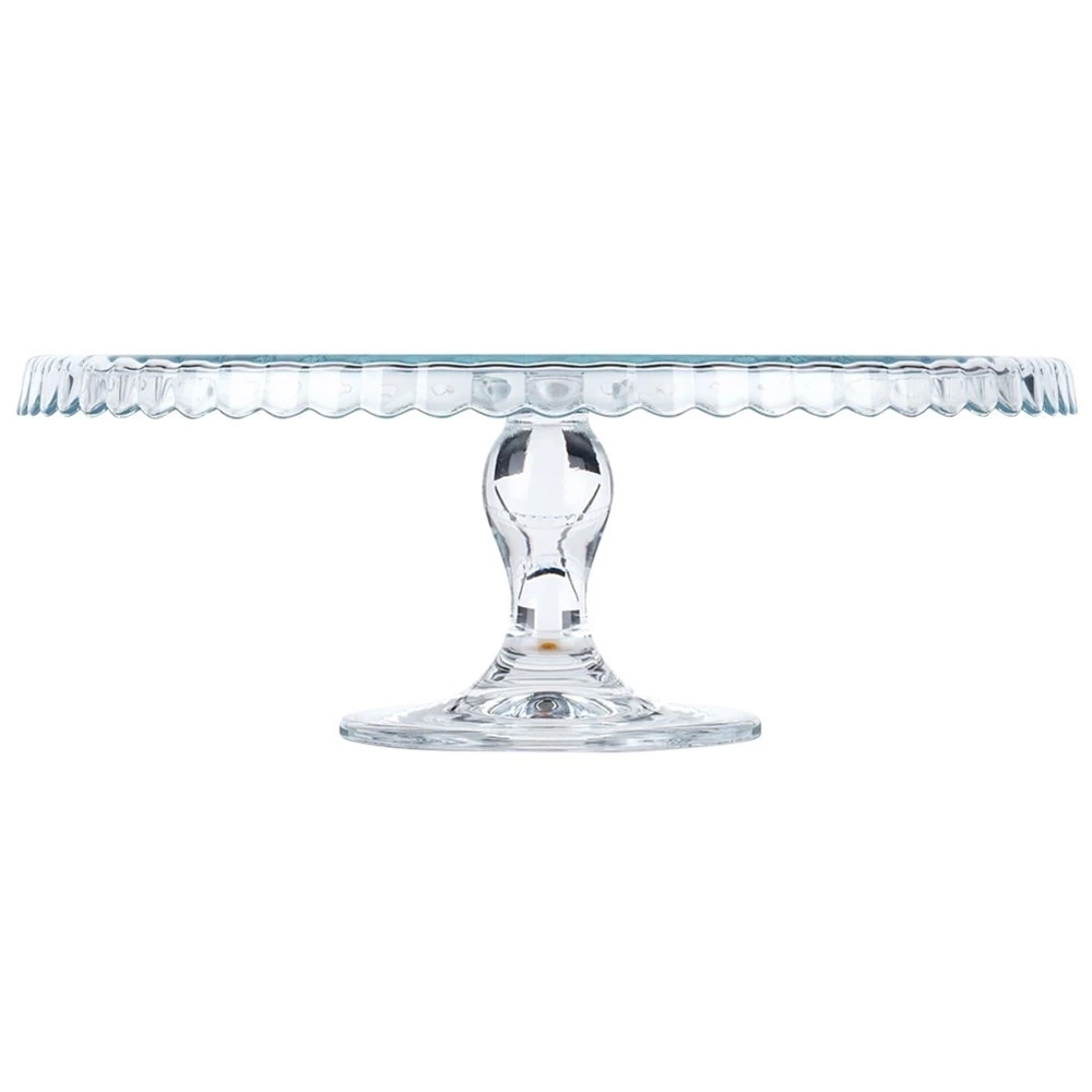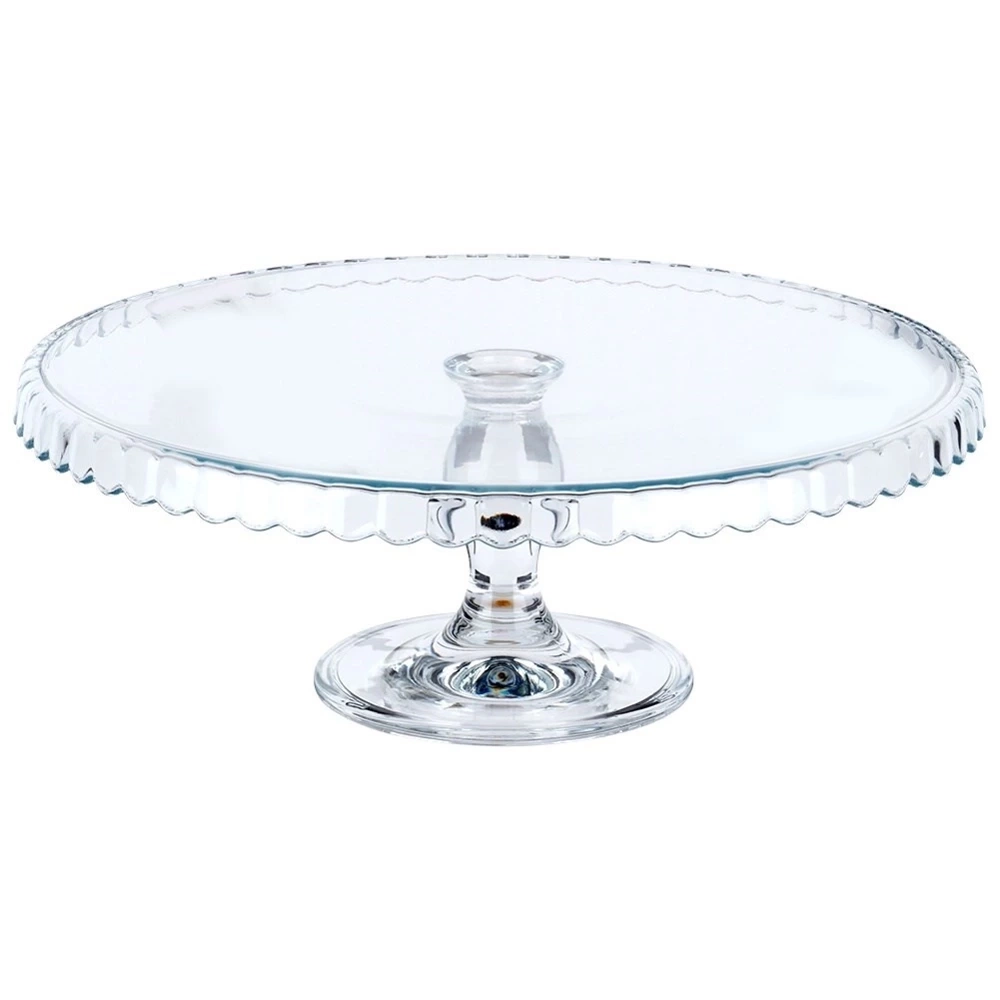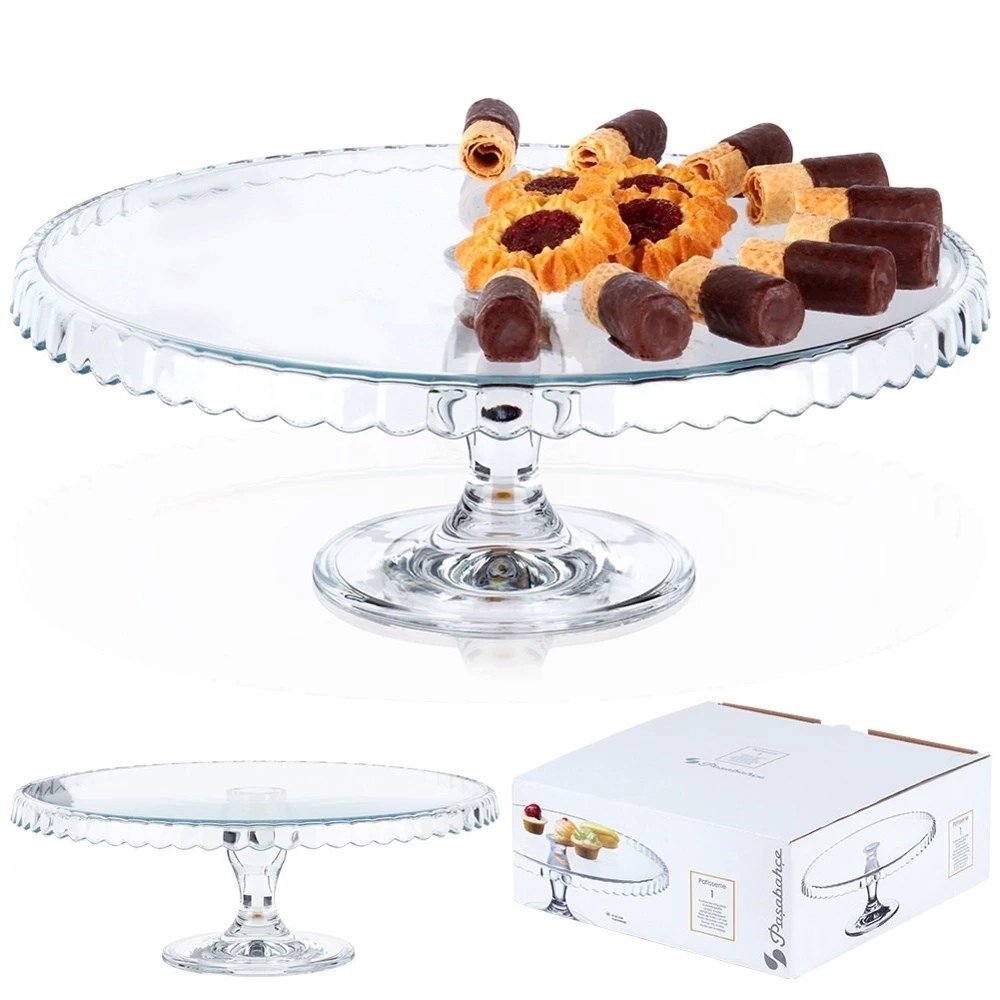 - Patera na nóżce o falistych krawędziach. Wykonana z wysokiej jakości szkła w przezroczystym kolorze. Idealna do ciast, tortów, muffinek, owoców.