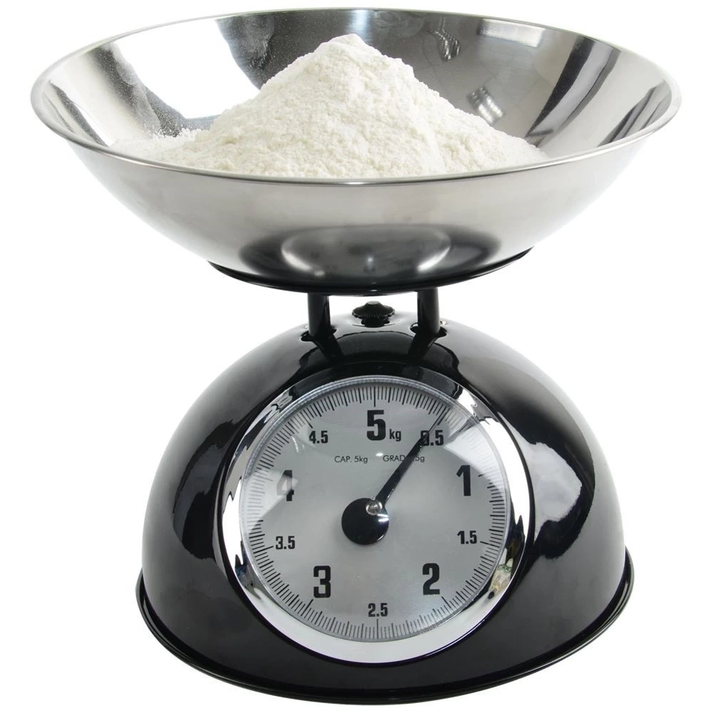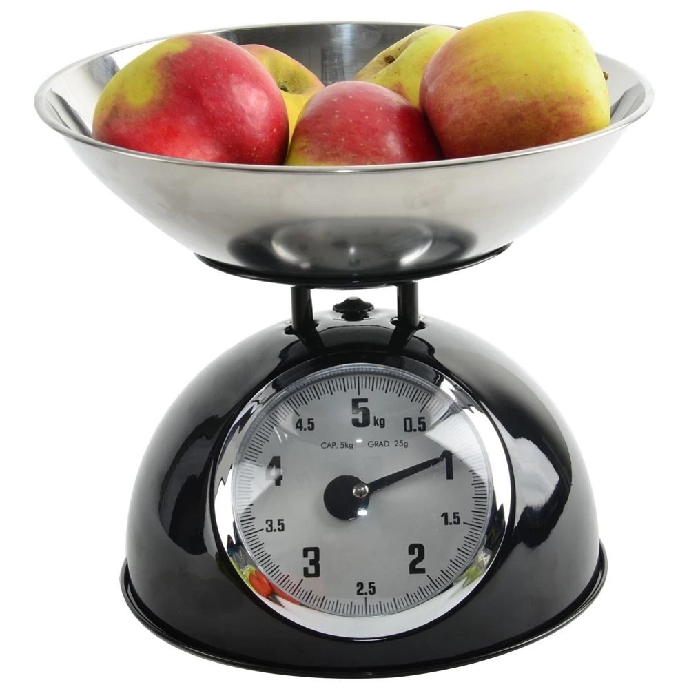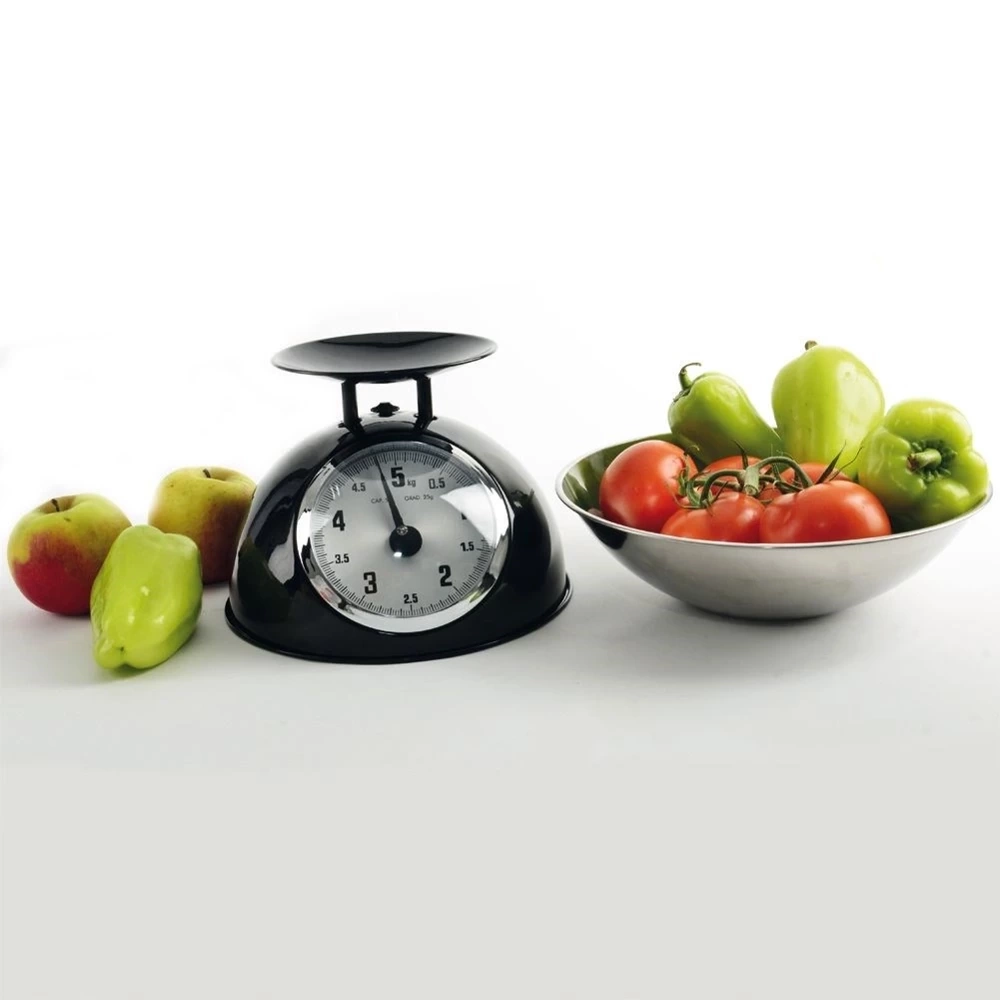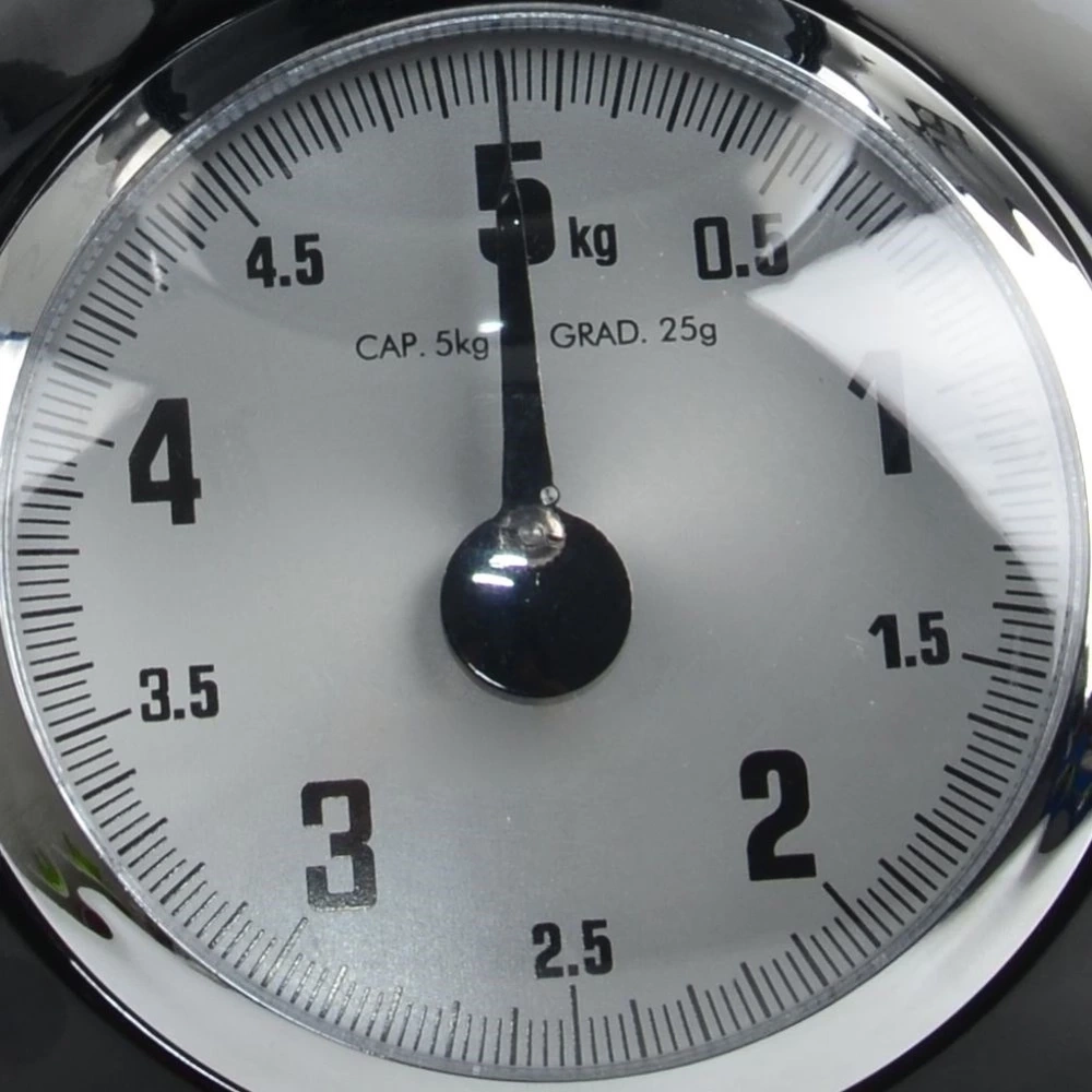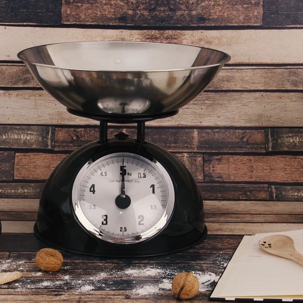 - Stalowa waga kuchenna ze zdejmowaną miską. Zakres wagi wynosi 5 kg. Waga posiada oryginalny design, utrzymana w stylu retro. Niezbędna w każdej kuchni.