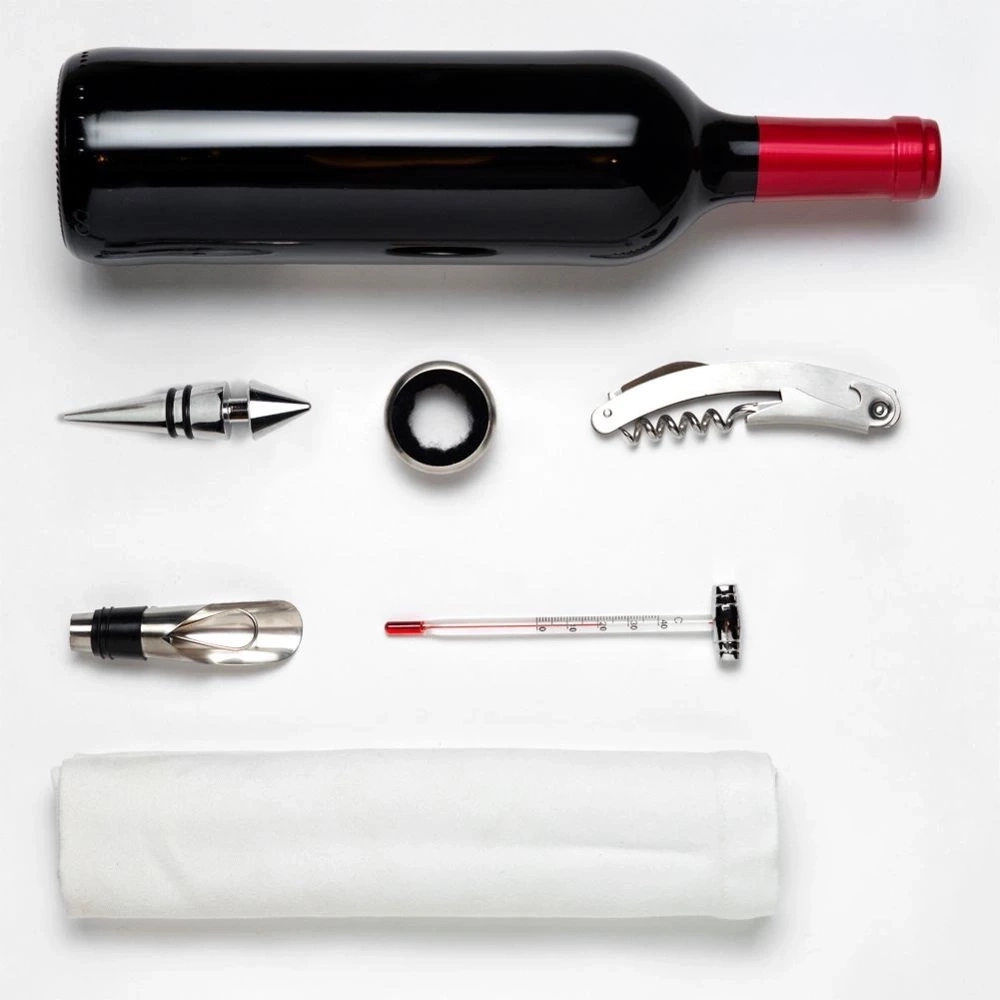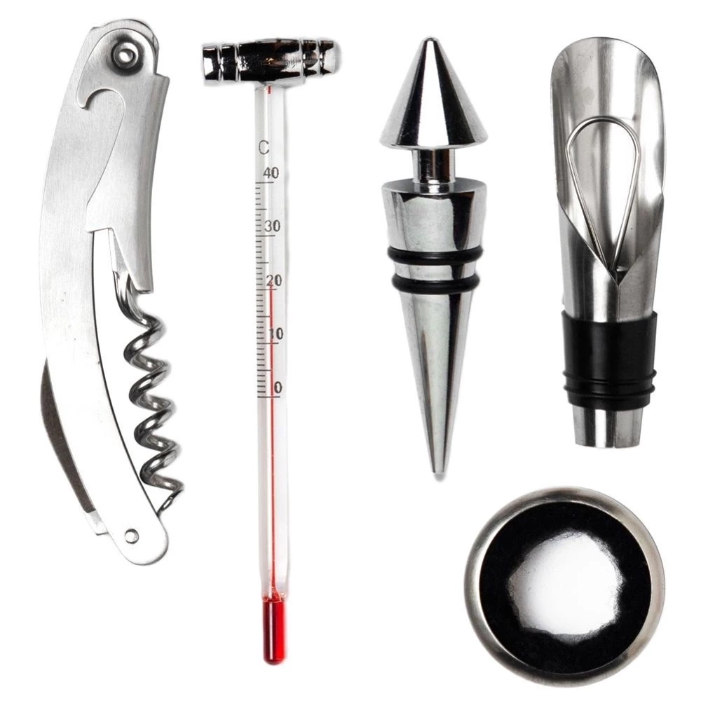 - PRAKTYCZNE - Zestaw pięciu akcesoriów do wina, umożliwia wygodne i pełne cieszenie się winem. W zestawie: otwieracz z nożykiem, zatyczka, lejek, pierścień na szyjkę butelki oraz termometr.