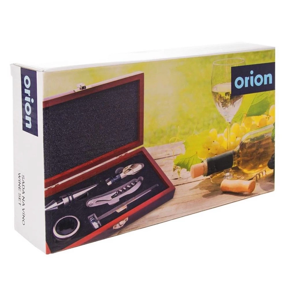 Akcesoria do wina, umieszczone w eleganckim opakowaniu, zostały wykonane z trwałych materiałów. W zestawie znajduje się szereg niezbędnych akcesoriów. Otwieracz do wina umożliwia wygodne otwieranie butelek, a także przecinanie folii lub laku na szyjce za pomocą noża. Zatyczka do butelek gwarantuje zachowanie świeżości wina i innych napojów po otwarciu. Nalewak z zatyczką umożliwia płynne i precyzyjne nalewanie wina bez kapania. Termometr pozwala kontrolować temperaturę wina, co jest kluczowe przy serwowaniu różnych rodzajów trunku w odpowiednich warunkach. Pierścień (niekapek) zapobiega kapaniu wina po nalaniu do kieliszka lub kubka, utrzymując stół oraz obrus w czystości. Zestaw akcesoriów do wina to idealny pomysł na prezent dla bliskich. Oryginalny produkt czeskiej marki Orion. Wyprodukowano zgodnie z europejskimi standardami.