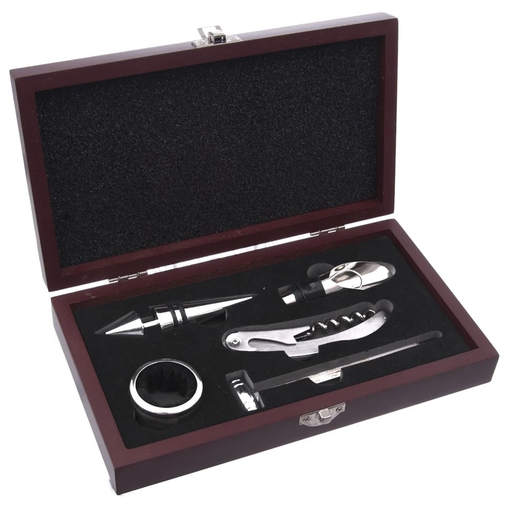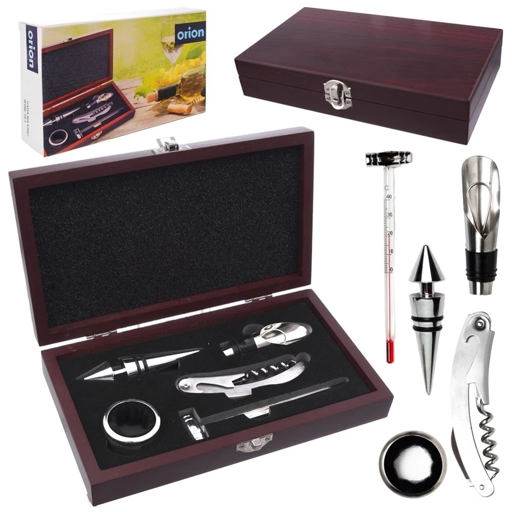 - Zestaw do wina w prezentowym opakowaniu. Zestaw zawiera korkociąg z dźwignią i nożem do zdejmowania laku, zatyczkę, nalewak z zatyczką termometr oraz pierścień na szyjkę butelki.
