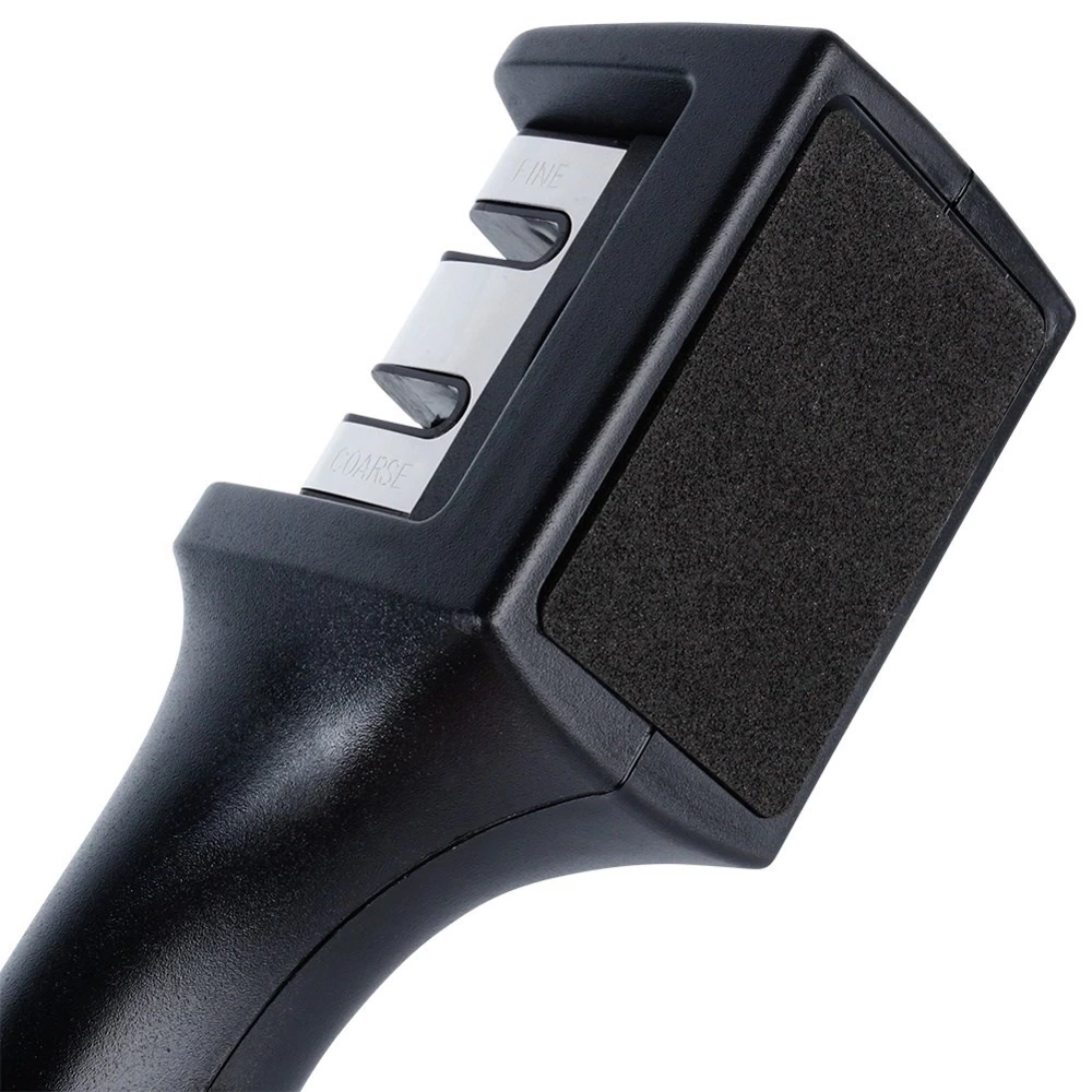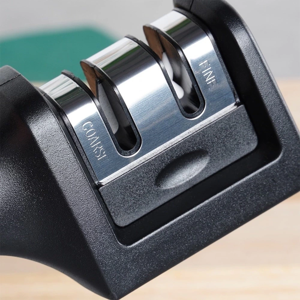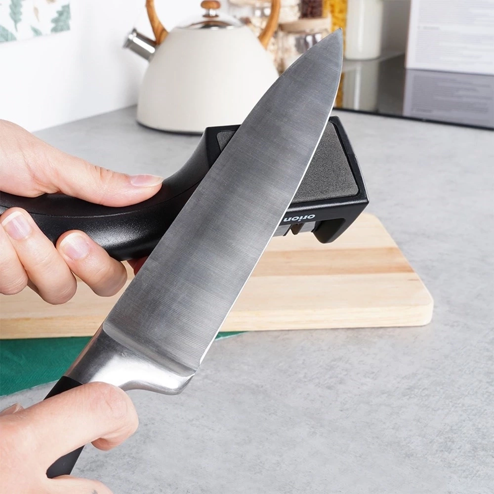 - PRAKTYCZNA - Ostrzałka posiada dwie głowice: węglową do ostrzenia oraz ceramiczną do polerowania. Nadaje się do prostych noży kuchennych, np. szefa kuchni.