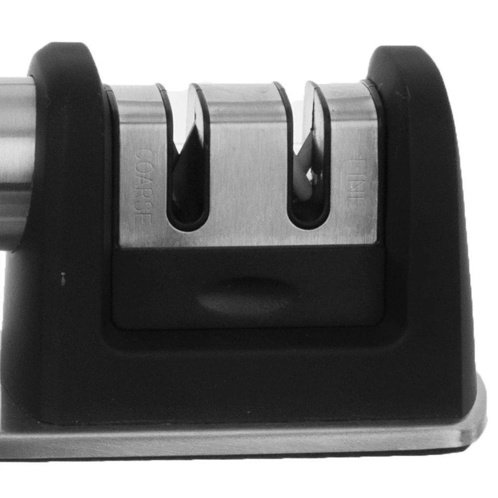 - PRAKTYCZNA - Ostrzałka posiada dwie głowice: metalową z cząstkami diamentu do ostrzenia oraz ceramiczną do polerowania. Nadaje się do prostych noży kuchennych, np. szefa kuchni.