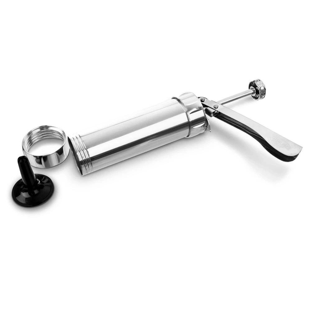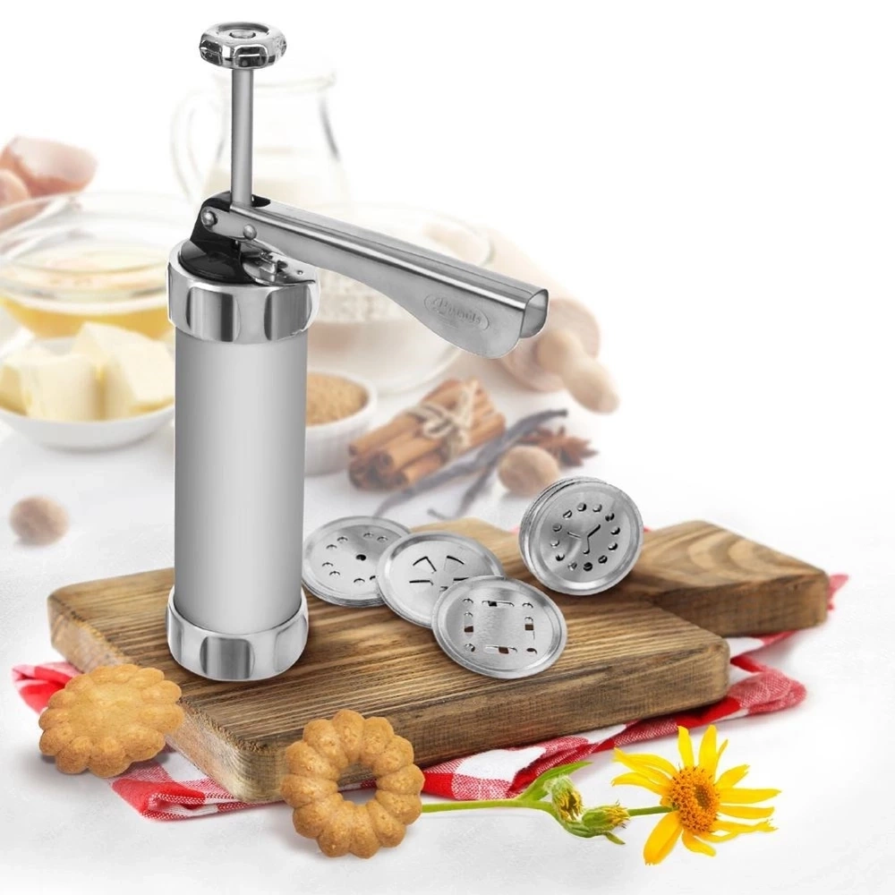 Maszynka do wyrabiania ciastek oraz dekorowania ciast, tortów czy babeczek. Niezwykle przydatna podczas tworzenia różnych deserów. Solidnie wykonana pozwoli na wygodne użytkowanie. Łatwa w użyciu, gdyż wystarczy jedno naciśnięcie aplikuje odpowiednią ilość ciasta. Idealna do dekorowania i nadziewania wszelkich słodkich i pikantnych wyrobów. Sprawdzi się zarówno do użytku domowego jak i profesjonalnego. Oryginalny produkt czeskiej marki Orion. Wyprodukowano zgodnie z europejskimi standardami.