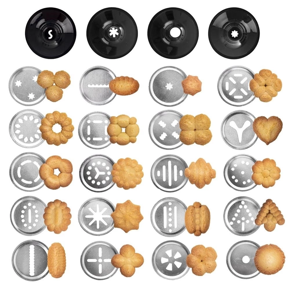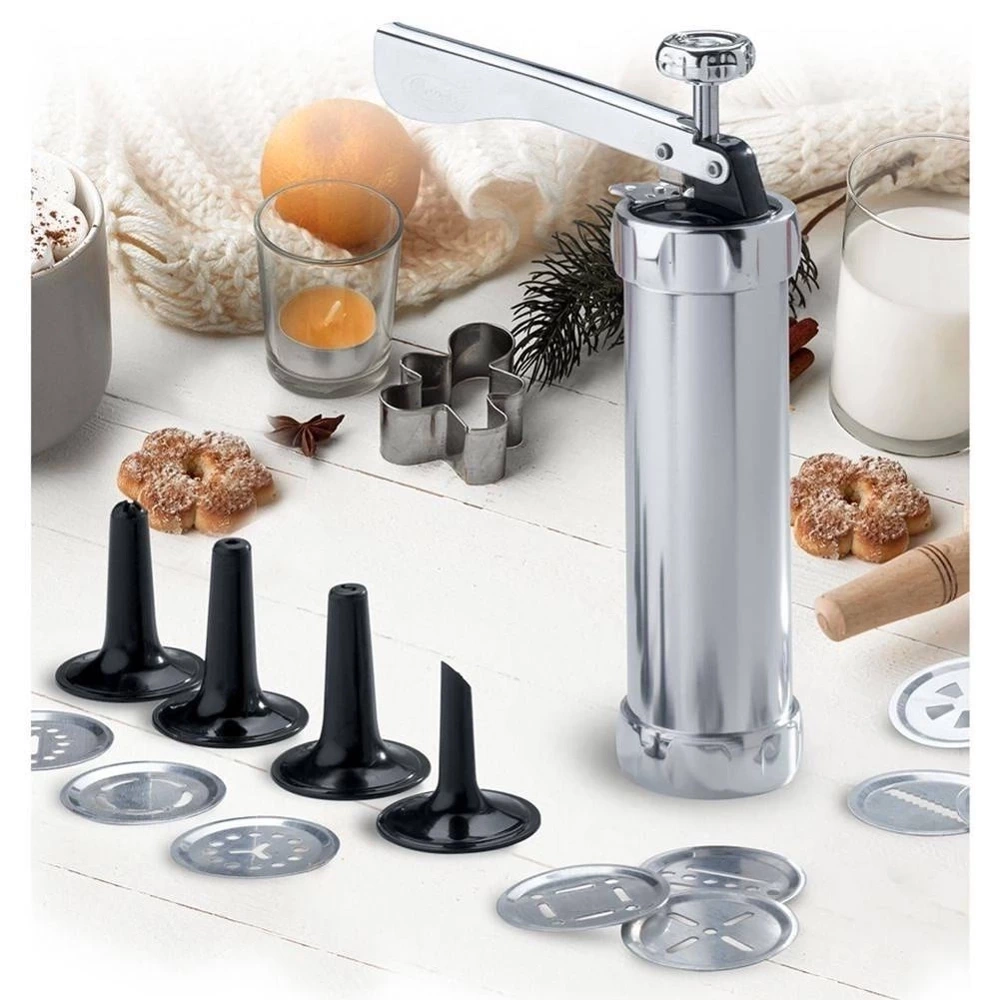 - Maszynka o długości 21 cm do wyrabiania ciastek oraz dekorowania ciast, tortów, babeczek i innych deserów. Zestaw składa się z 25 elementów.
