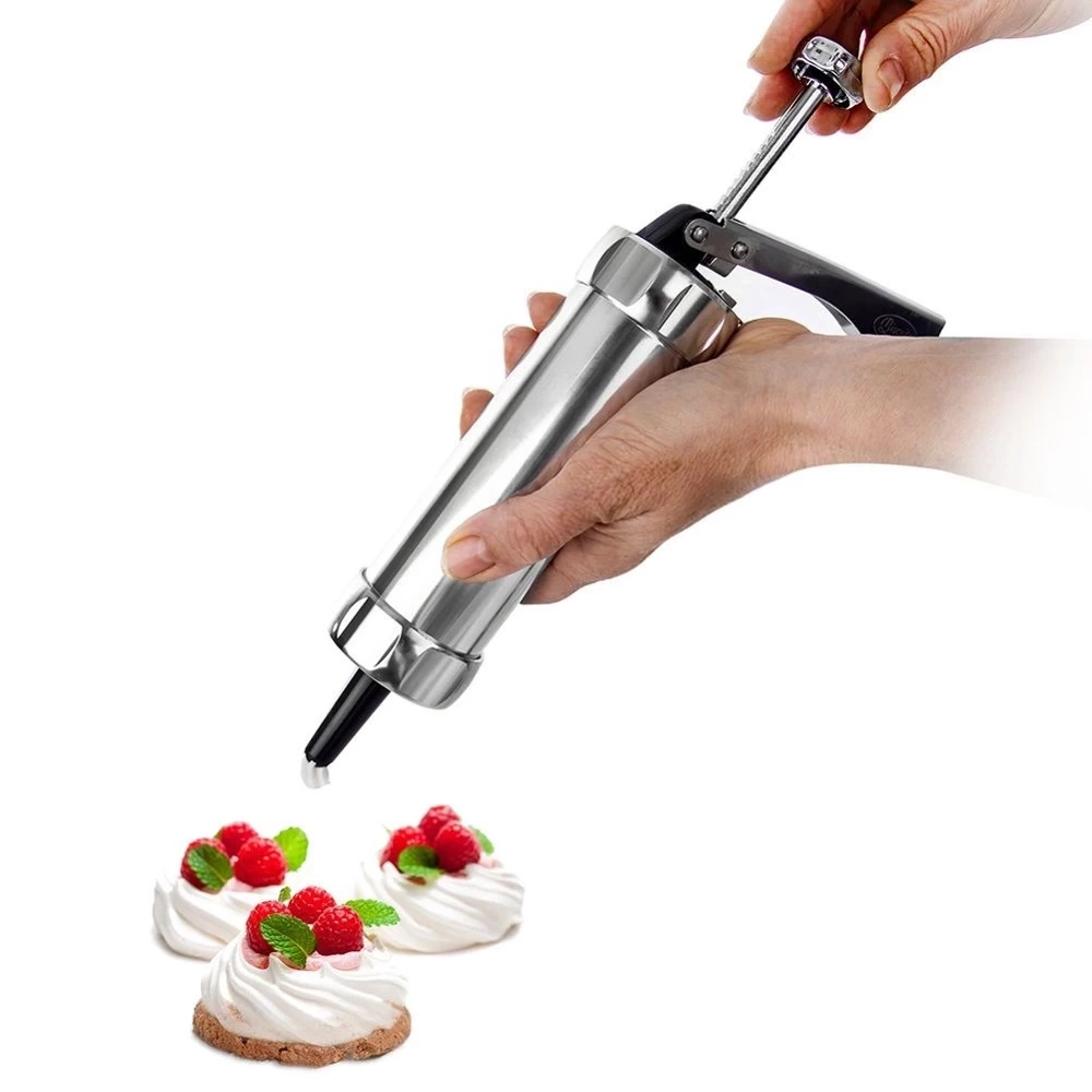 - PRAKTYCZNA - Maszynka do wyrabiania ciastek oraz dekorowania ciast, tortów, babeczek i innych deserów. Maszynka ma długość 21 cm i średnicę 5,5 cm.