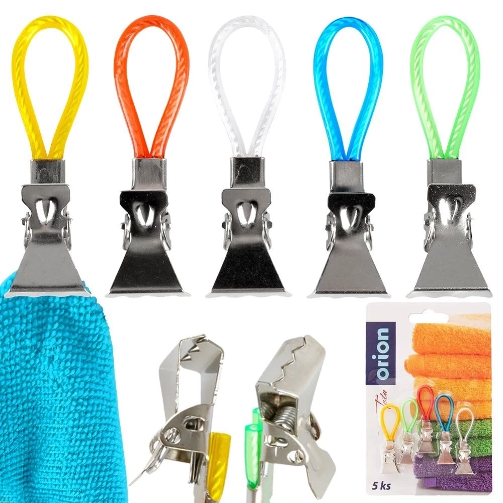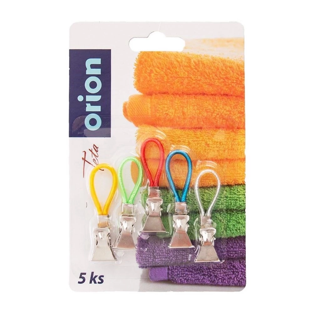 Zestaw pięciu klipsów na ręczniki oraz ściereczki. Wymiary klipsów to 5 x 0.5 x 1,5 cm. Każdy z wieszaków jest w innym kolorze. Znakomity gadżet do każdej łazienki i kuchni. Dzięki nim bez problemu zawiesimy ściereczki lub ręczniki, które na posiadają uszka do zawieszenia. Wytrzymały klips zapewni odpowiednie trzymanie. Oryginalny produkt czeskiej marki Orion. Wyprodukowano zgodnie z europejskimi standardami.