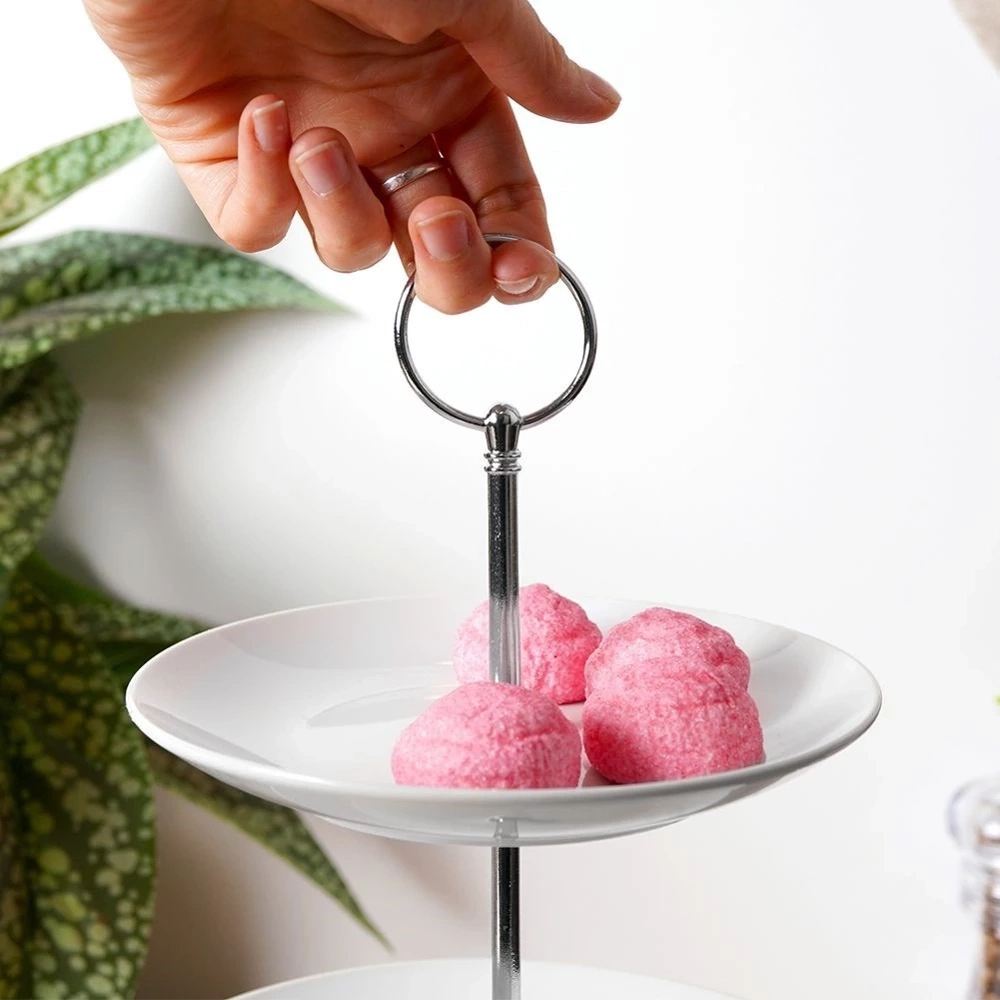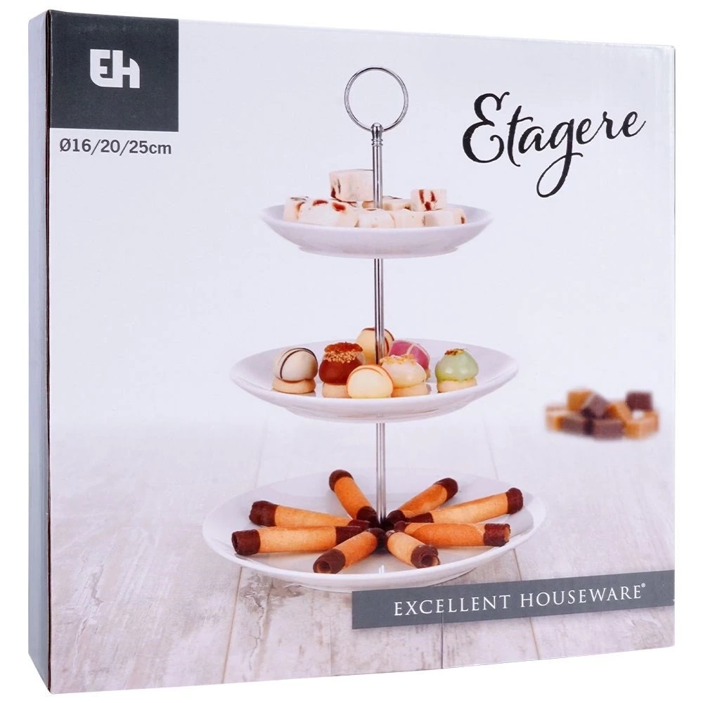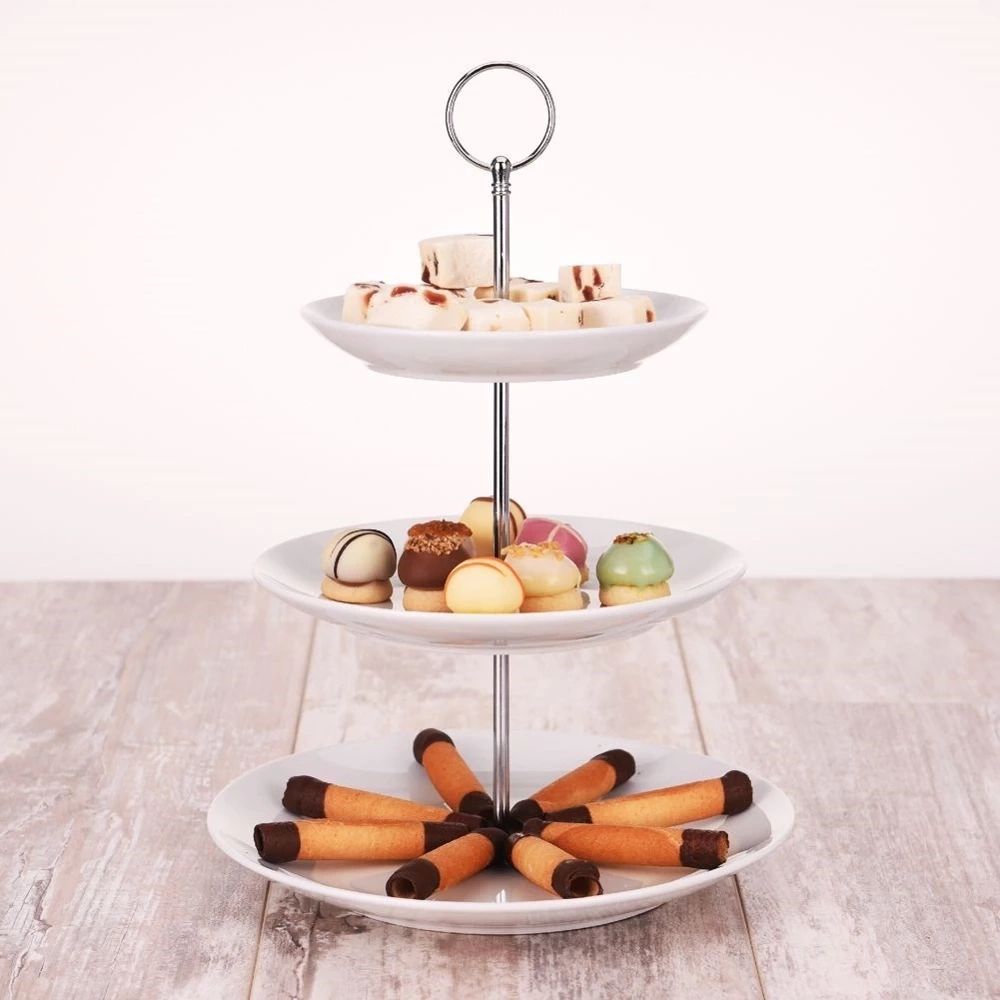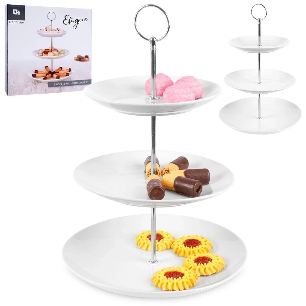 - Piętrowa patera na ciastka, ciasto, owoce, przystawki, przekąski. Posiada 3 poziomy składające się z tac wykonanych z porcelany w białym kolorze.