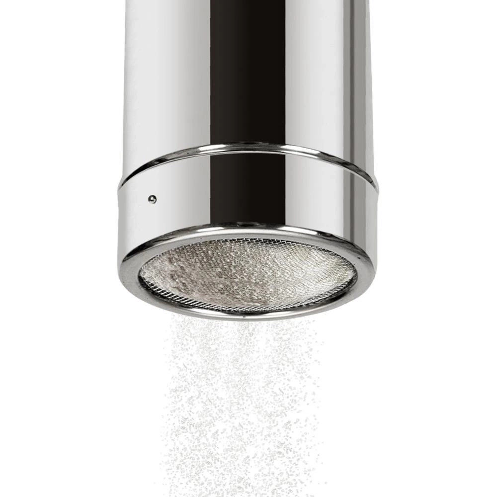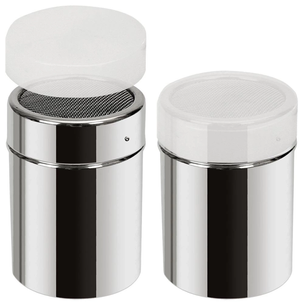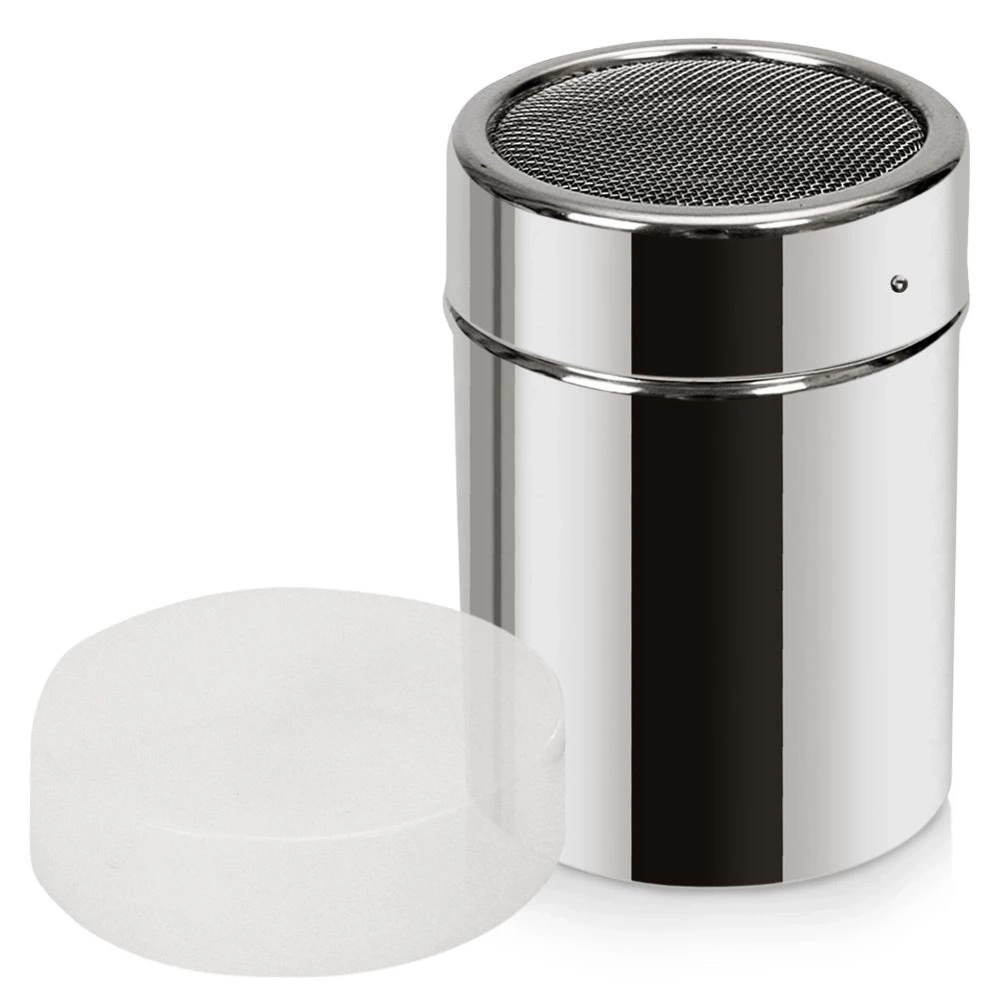 - Pojemnik z sitkiem i pokrywką do przechowywania produktów sypkich. Sprawdzi się do dozowania cukru pudru, kakao, czekolady, kawy, posypki czy cynamonu. Wykonany ze stali nierdzewnej.