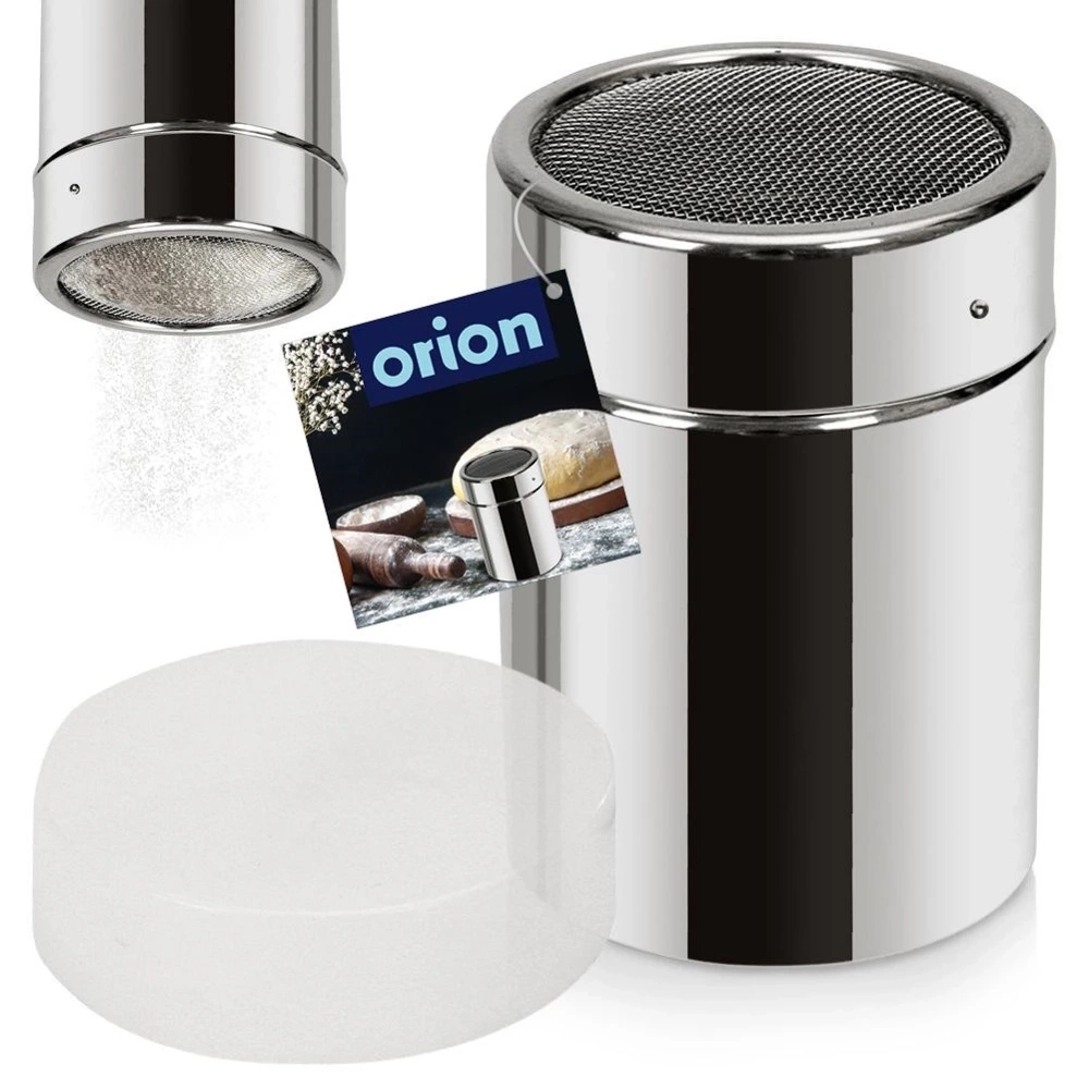 Pojemnik o pojemności 300 ml i średnicy 7 cm z sitkiem i pokrywką. Wykonany z wysokiej jakości stali nierdzewnej a pokrywka z przezroczystego tworzywa. Pojemnik wyposażony jest w gęste sitko, dlatego świetnie sprawdzi się do dozowania dodatków do kawy lub deserów w postaci kakao, czekolady, cynamonu, przypraw, cukru pudru. Wykorzystamy go również jako cukiernicę do łatwego dozowania cukru lub cukru pudru. Zamykana pokrywka uchroni przechowywane dodatki lub przyprawy przed wilgocią oraz pozwoli zachować na dłużej aromat przechowywanych produktów sypkich. Oryginalny produkt czeskiej marki Orion. Wyprodukowano zgodnie z europejskimi standardami.