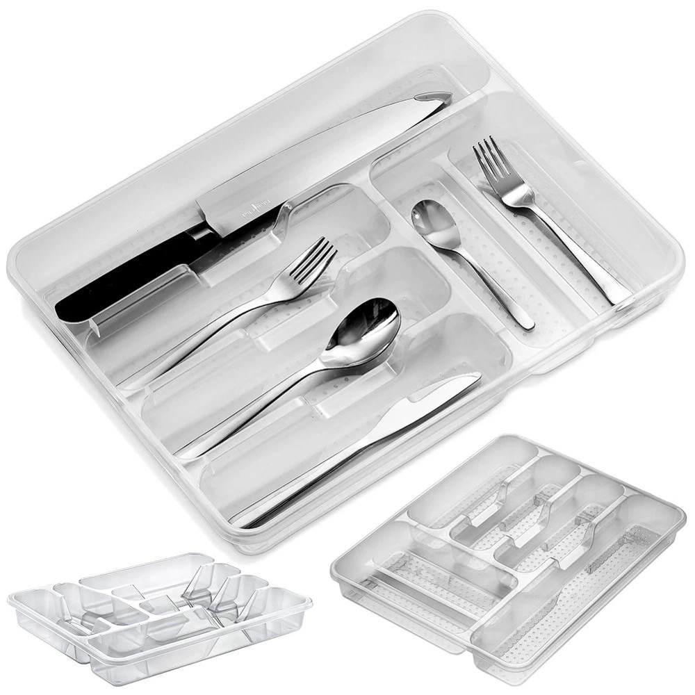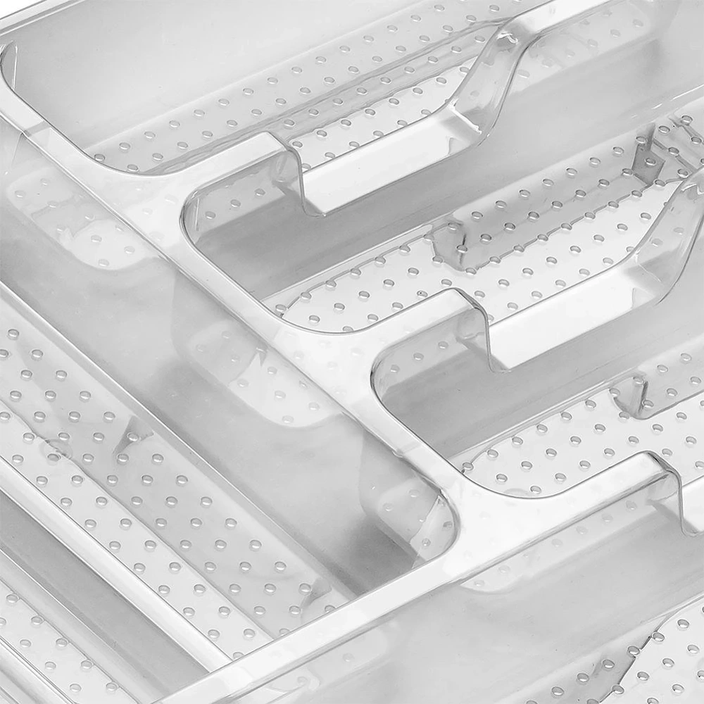 - Organizer na sztućce do szuflady. Wykonany z wytrzymałego, transparentnego tworzywa. Posiada 6 przegródek na sztućce, łyżeczki oraz przybory kuchenne.