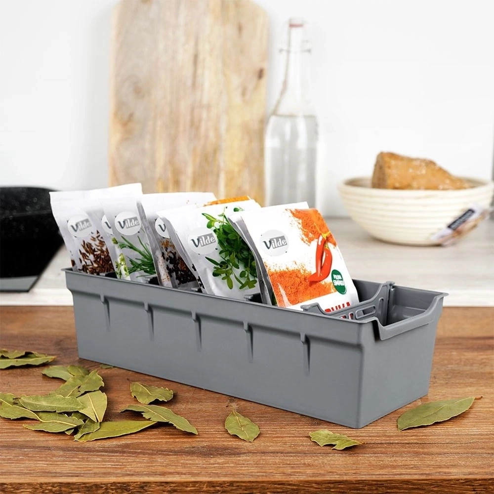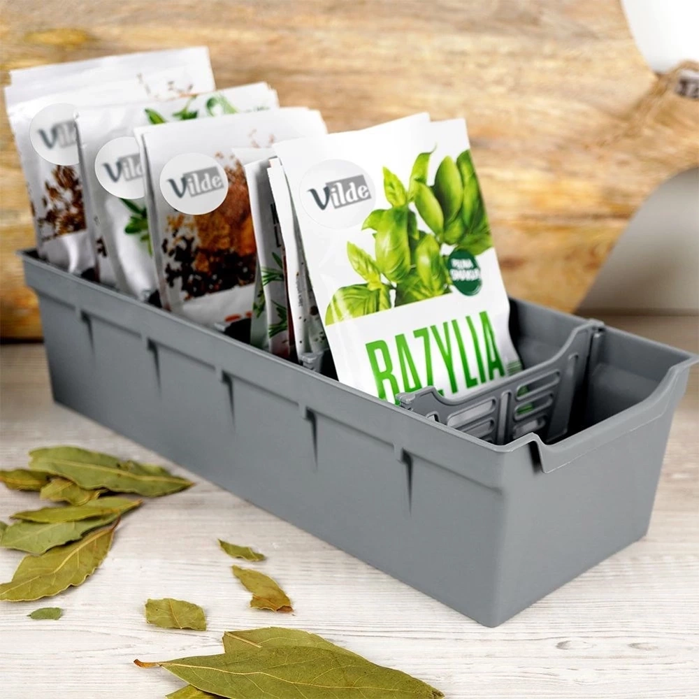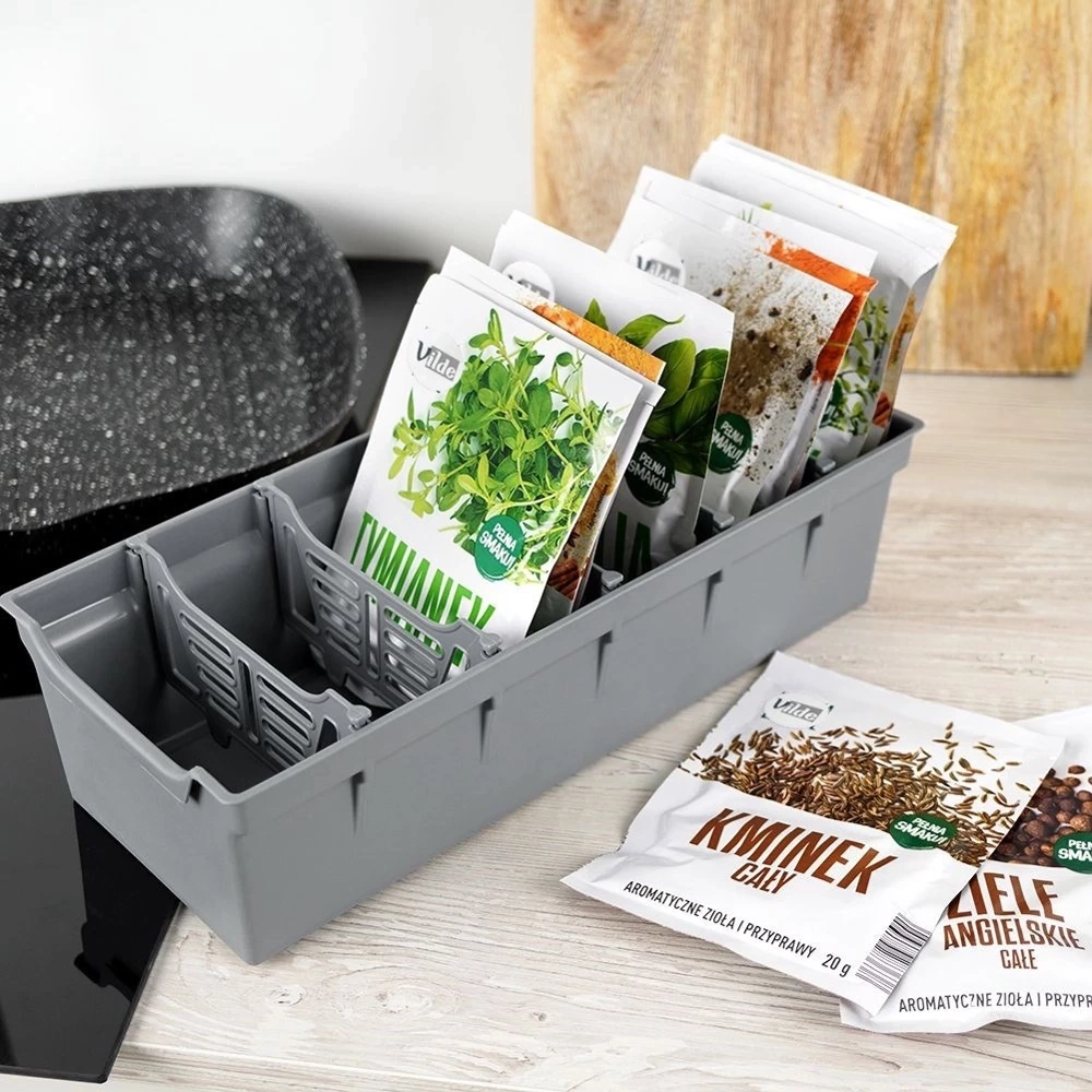 - Pojemnik do przechowywania torebek z przyprawami wykonany z tworzywa w kolorze szarym. Posiada pięć wyjmowanych przegródek.