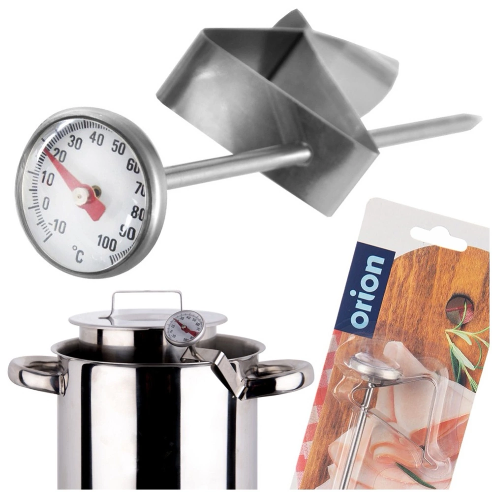 Termometr kuchenny do mierzenia temperatury z klipsem. Termometr jest poręczny i można zabrać go ze sobą w dowolne miejsce. Świetnie sprawdzi się podczas gotowania domowej szynki, pieczenia ciast, grillowania czy przygotowywania yerba mate. Termometr wykorzystamy również do sprawdzenia temperatury podgrzewanego mleka lub potraw dla dzieci. Pozwala na precyzyjne gotowanie, zapewnia bezpieczeństwo żywności i daje wygodę podczas przygotowywania potraw. Oryginalny produkt czeskiej marki Orion. Wyprodukowano zgodnie z europejskimi standardami.